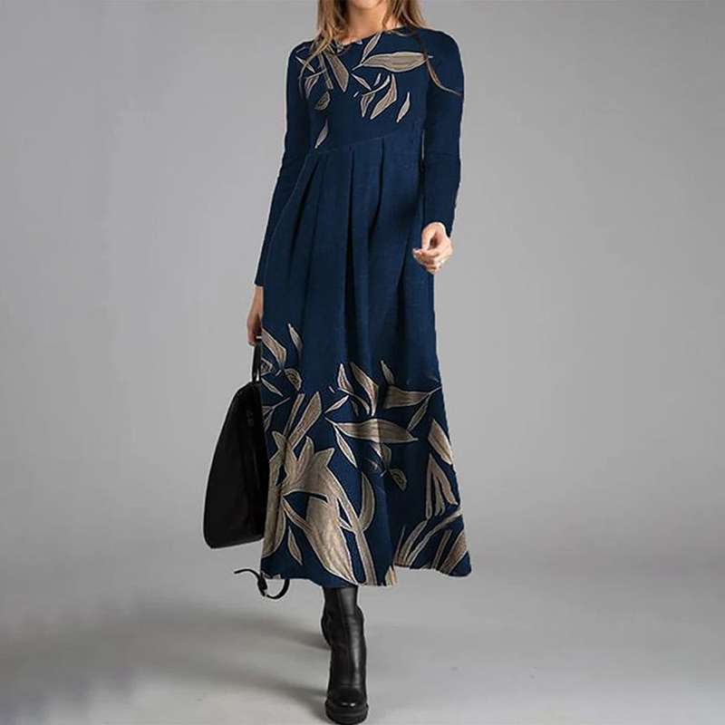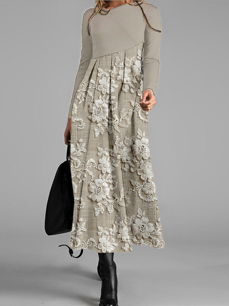 Elegant Floral Print Crew Neck Long Sleeve Wool Midi Dress