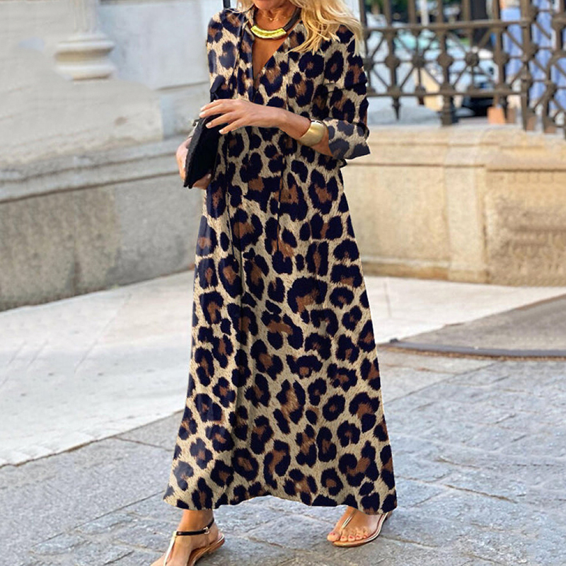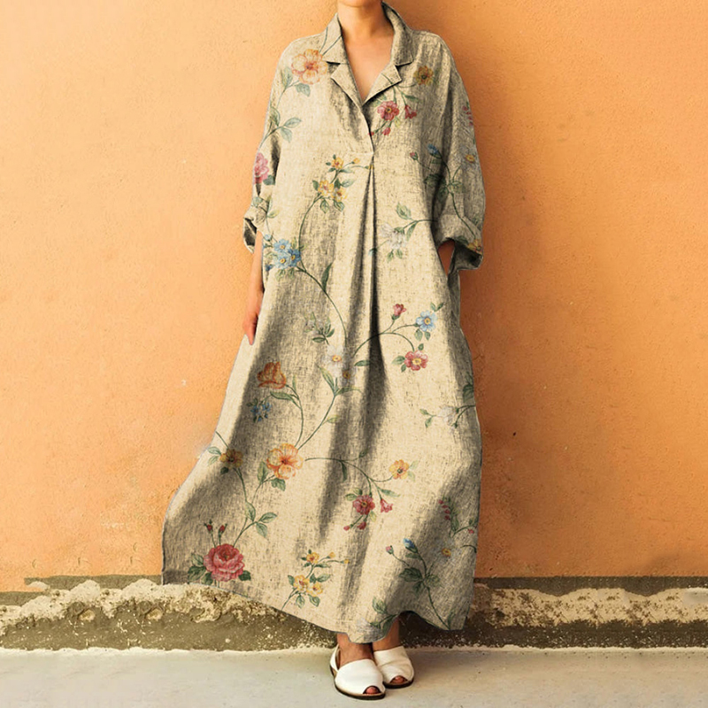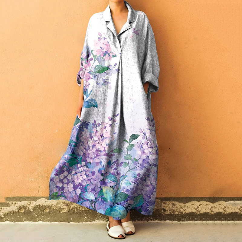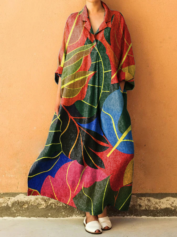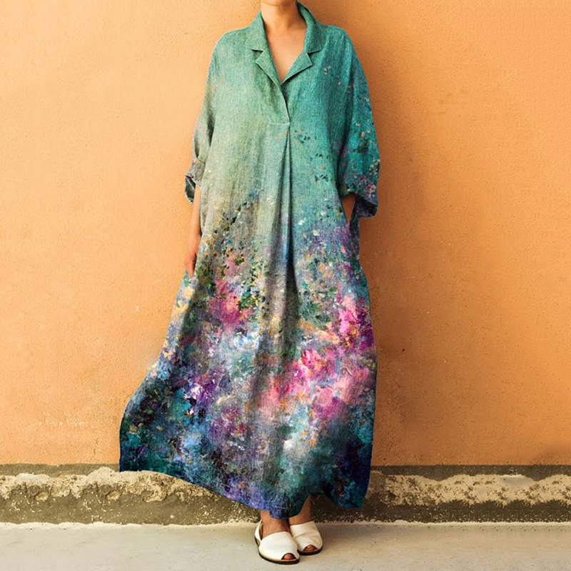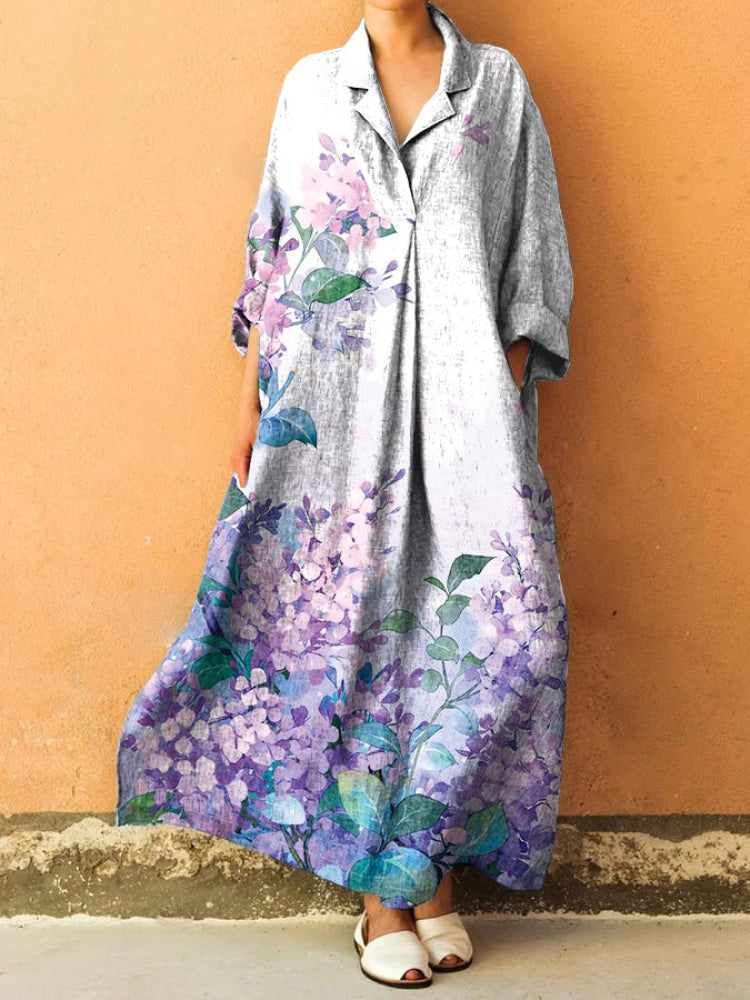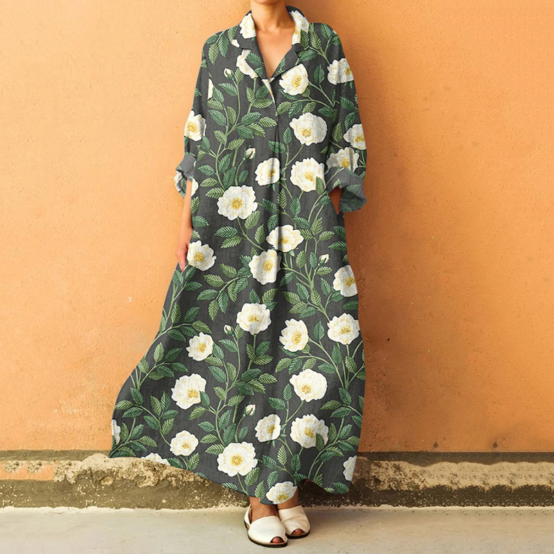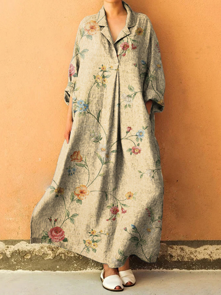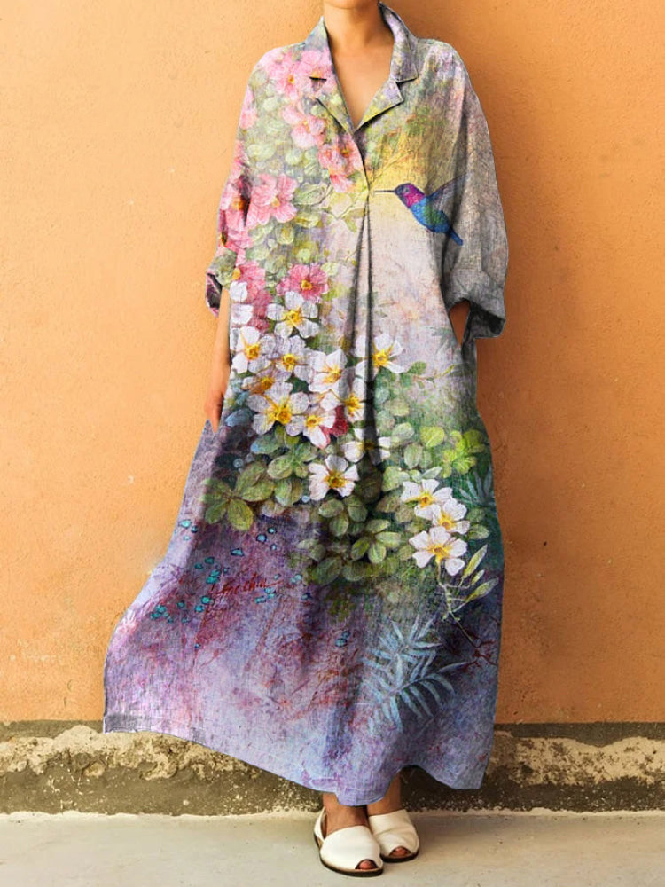 Floral Art Print Lapel Long Sleeve Loose Maxi Dress