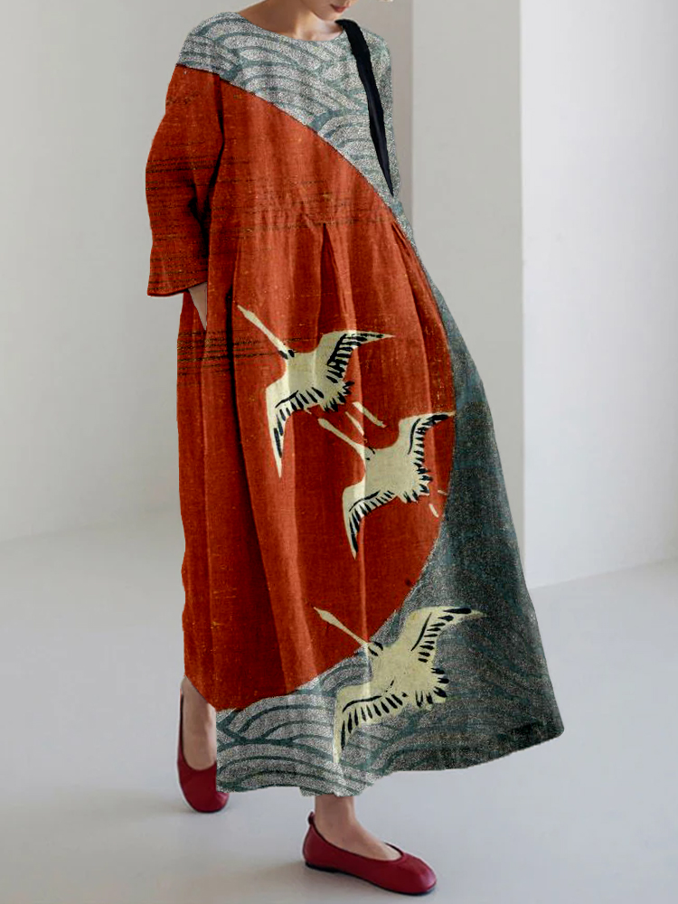Vintage Japanese Waves & Cranes Art Linen Blend Maxi Dress