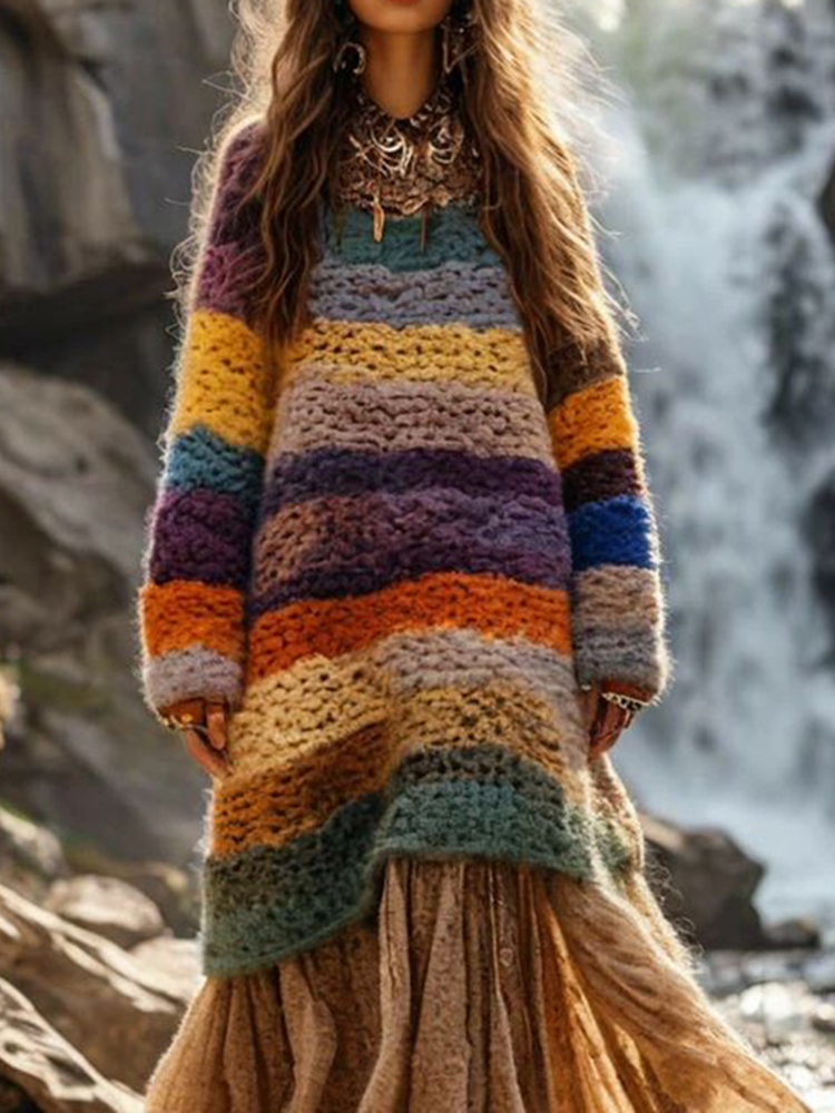 Vintage Rainbow Colorful Patchwork Cozy Knit Sweater Dress