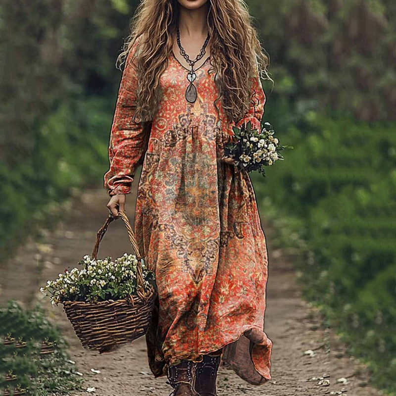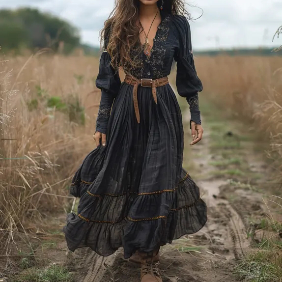 Vintage V-Neck Linen Women's Long-Sleeved Country Concert Dress