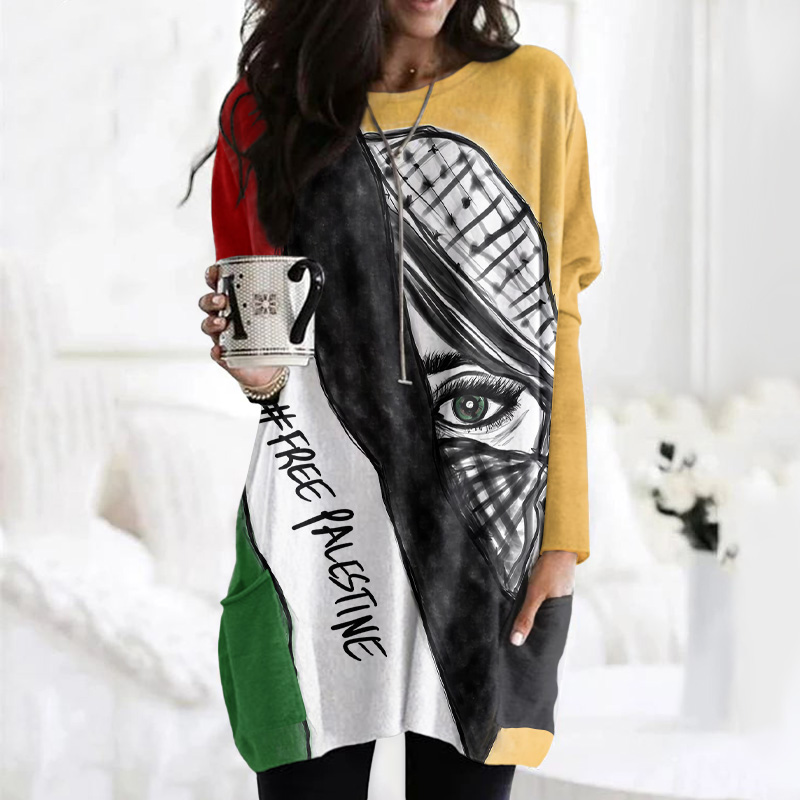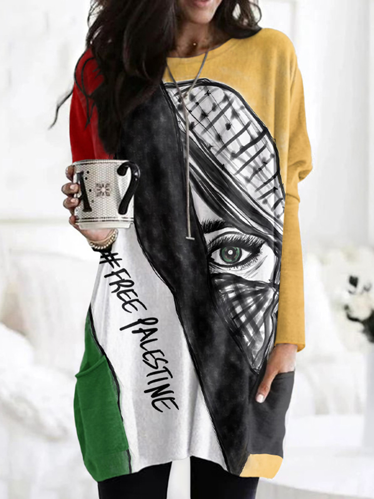 Women's Free Palestine Print Crew Neck Long Sleeve Tunic