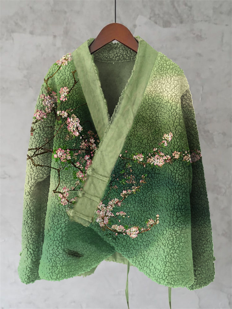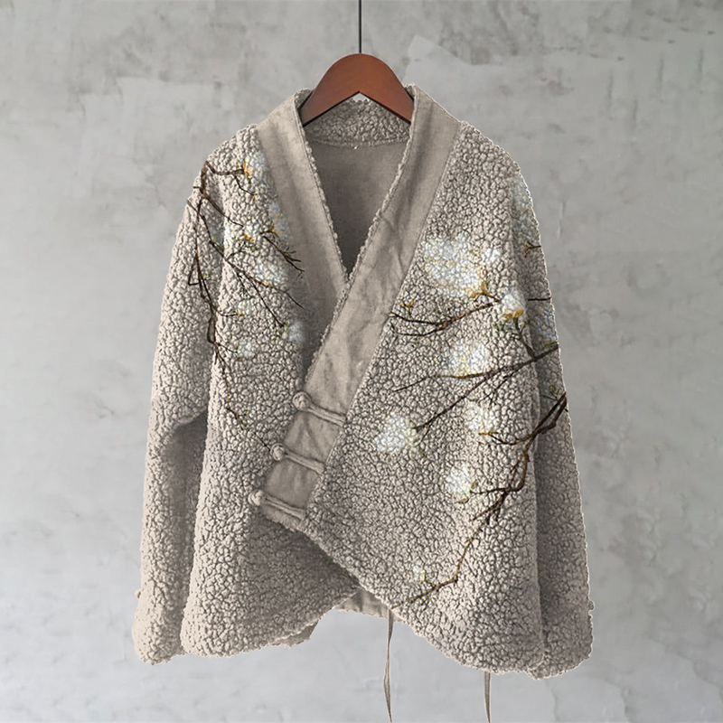 Magnolia Japanese Lino Floral Art Cozy Fleece Kimono Cardigan