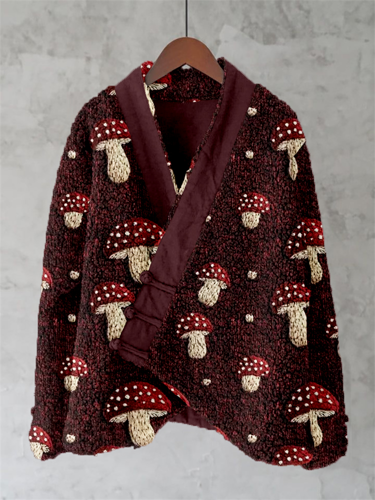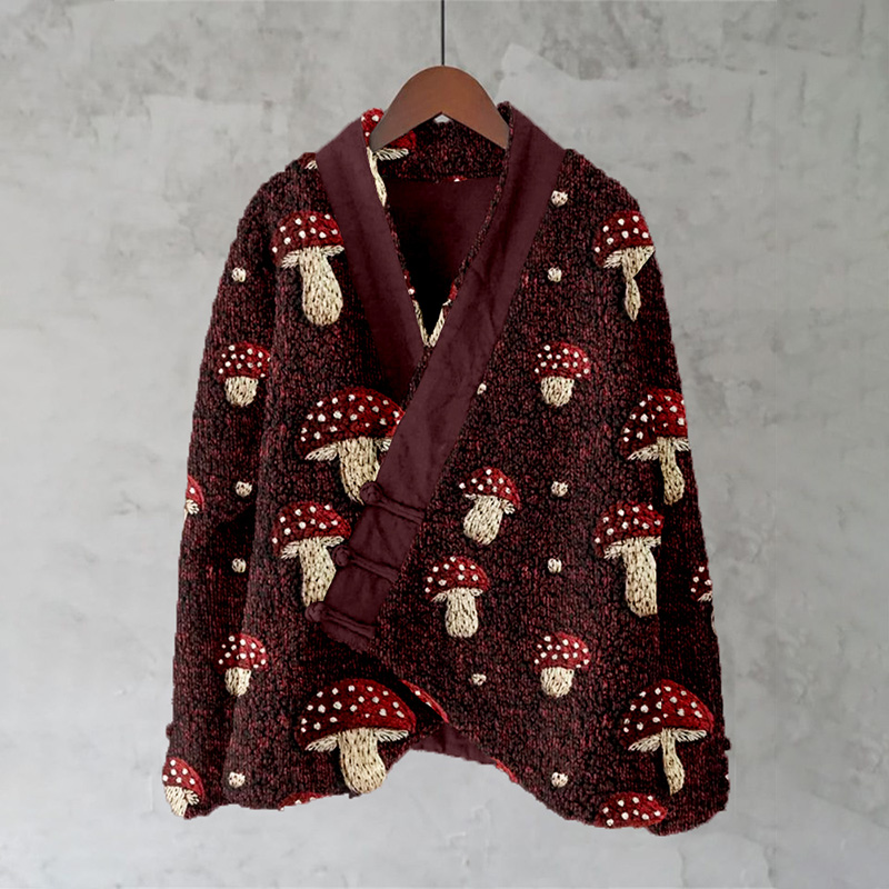 Cottagecore Mushroom Embroidered Fleece Kimono Cardigan