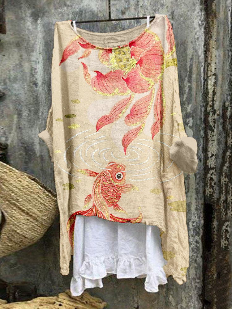 Lotus Flower And Carp Art Linen Blend Flowy Tunic