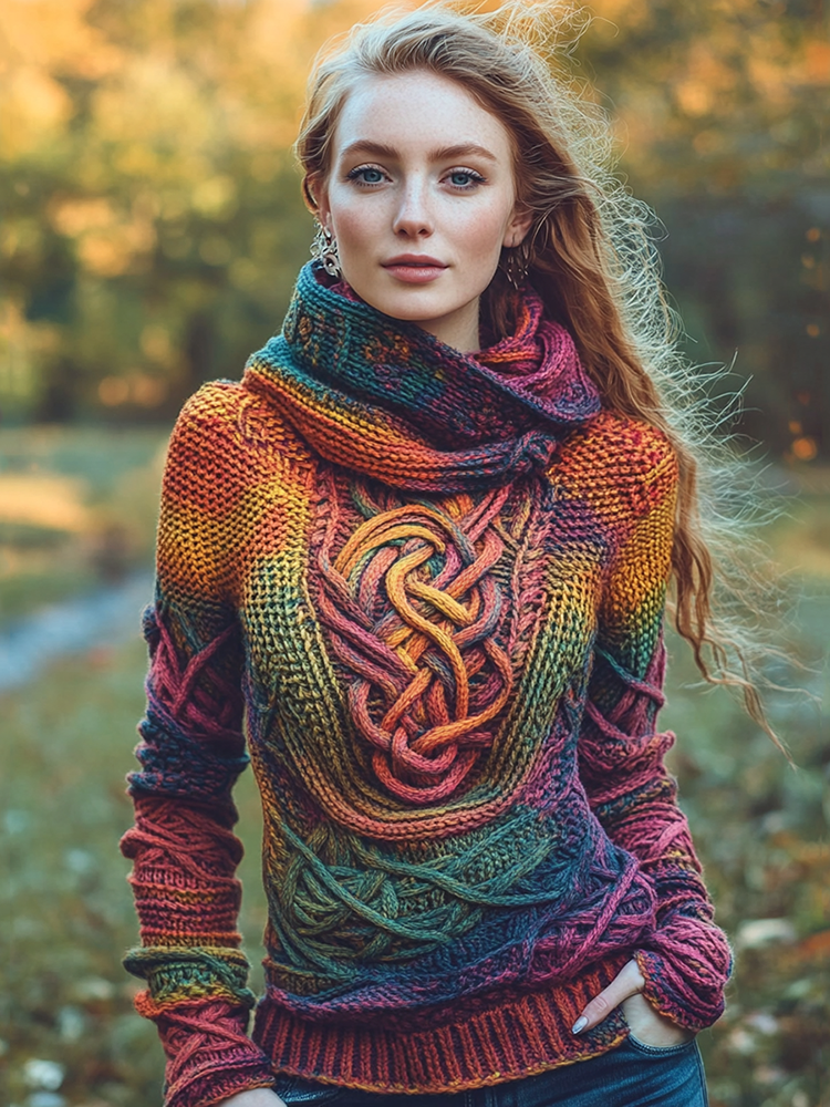 Women's Irish Rainbow Pattern Jacquard Pocket Cozy Hooded Sweater