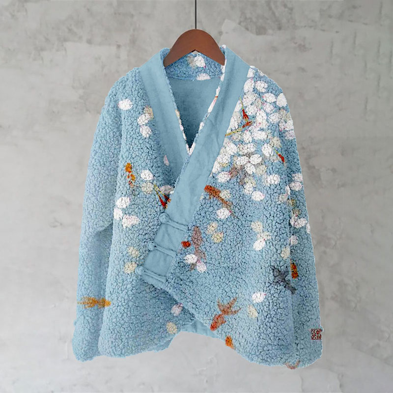 Koi And Sakura Art Pattern Fleece Kimono Cardigan