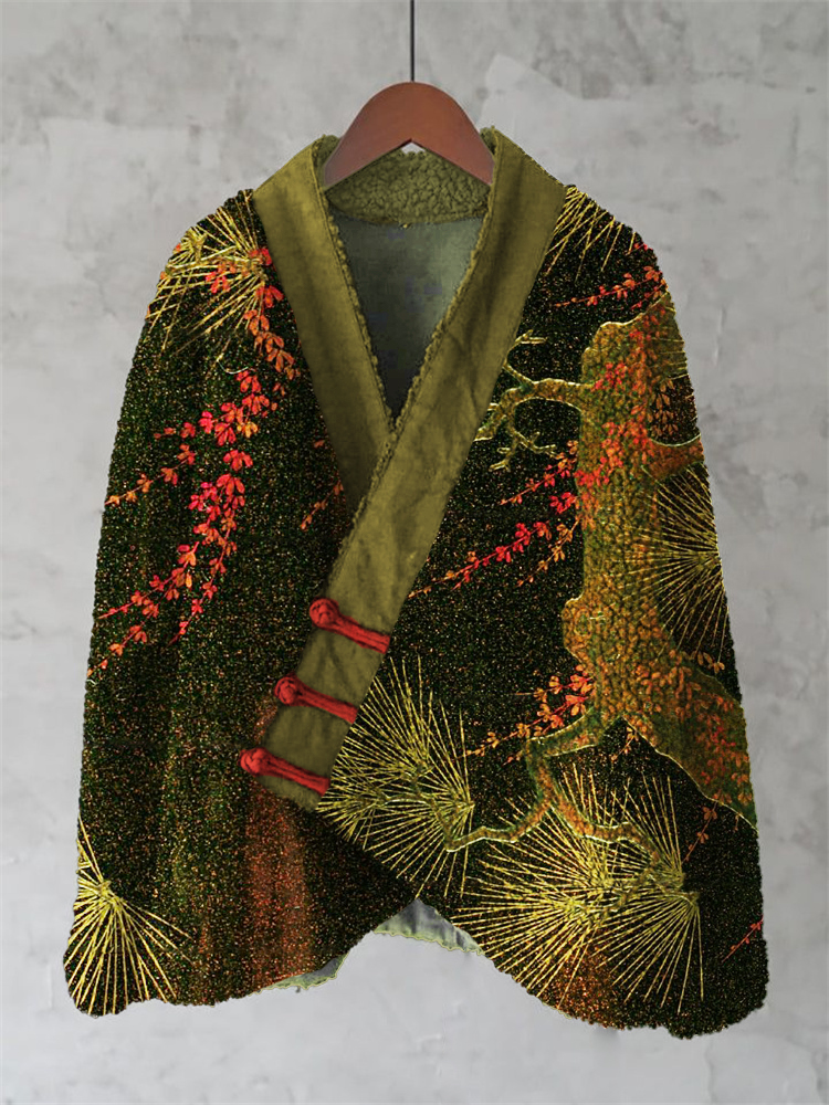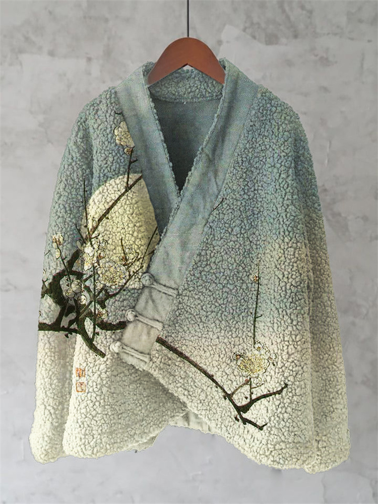 Plum Blossom Full Moon Japanese Art Cozy Fleece Kimono Cardigan