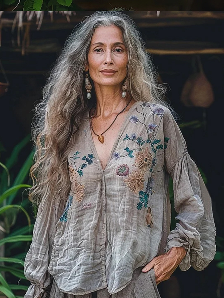 Retro Floral Tribal Embroidery Art Linen Blend Loose Blouse