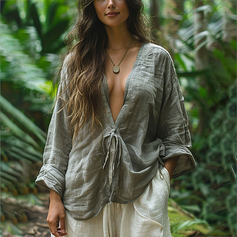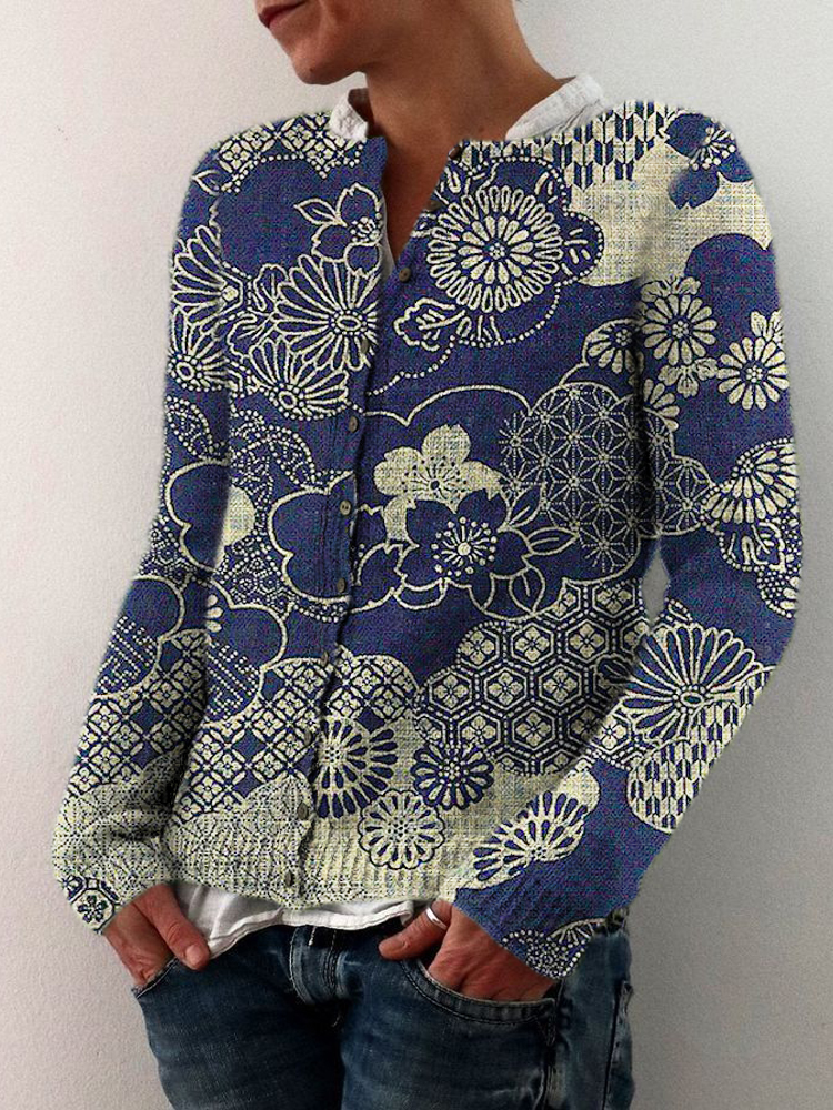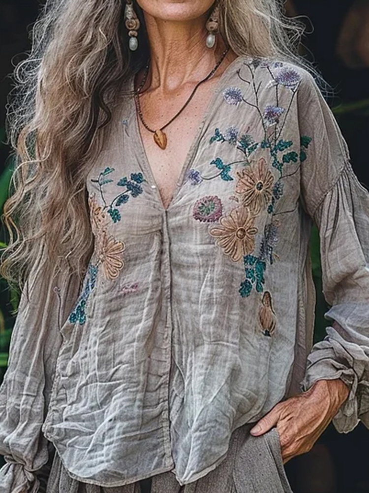 Retro Bohemian Linen Floral Art Print Long Sleeve V-neck Shirt