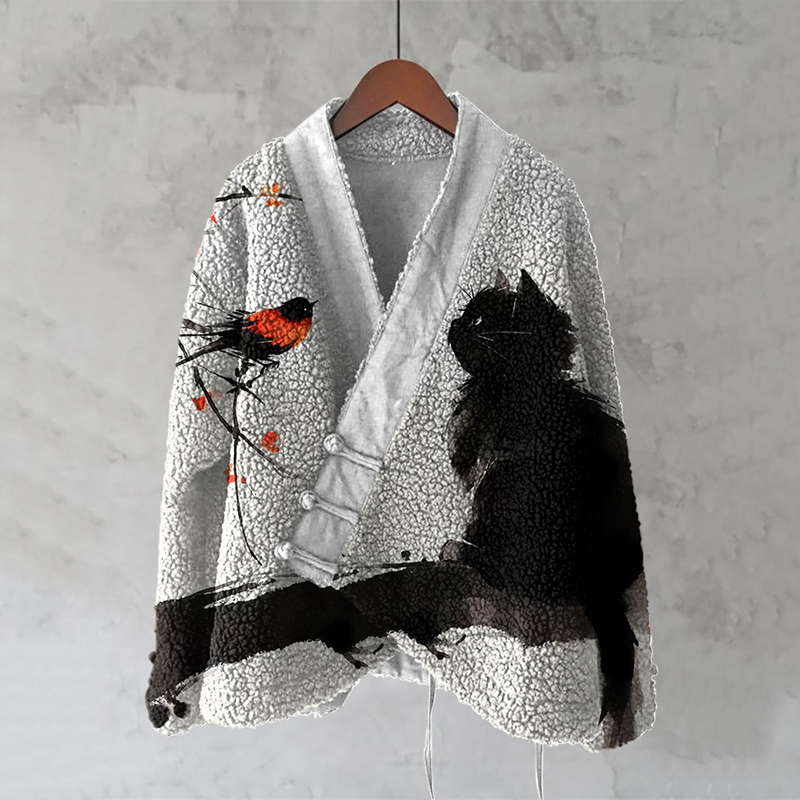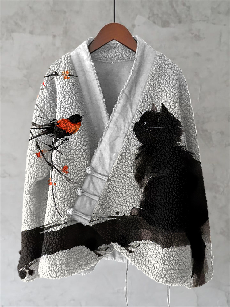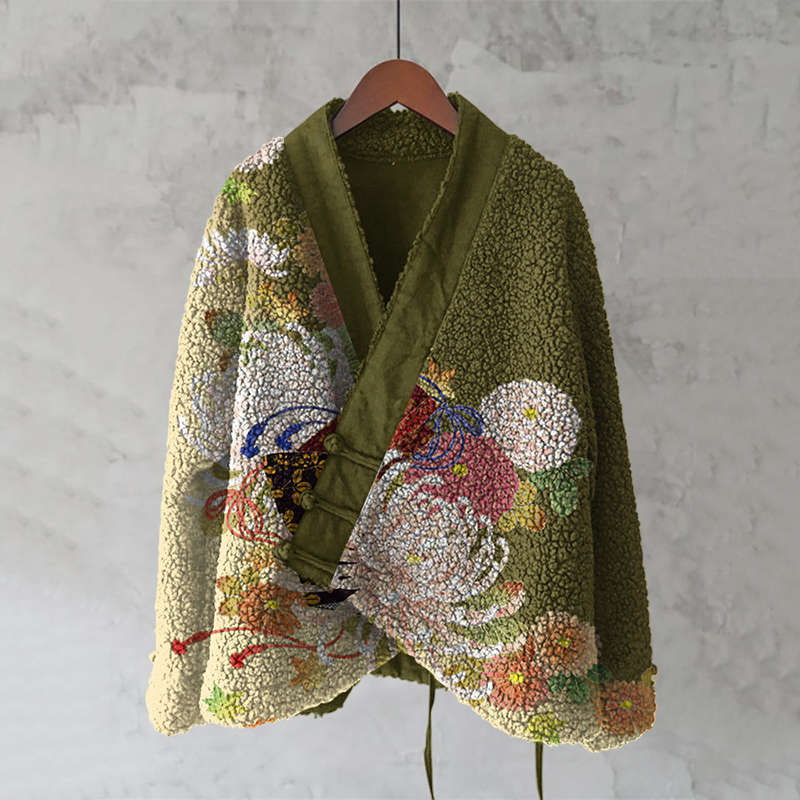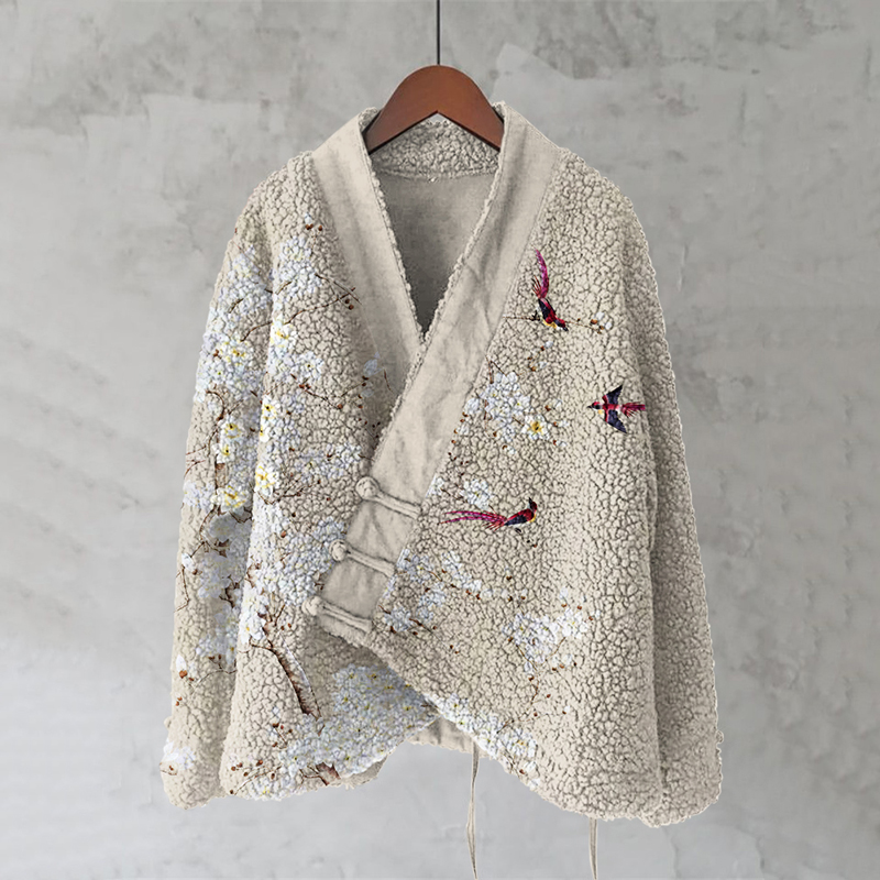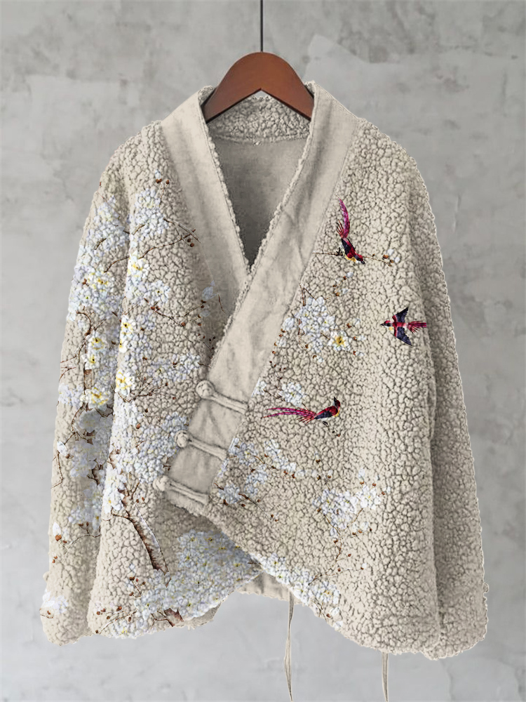 Japanese Style Flower And Bird Art Plush Cardigan