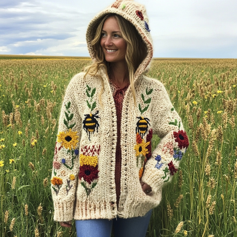 Rustic Bee & Floral Knit Art Women's Hooded Cardigan