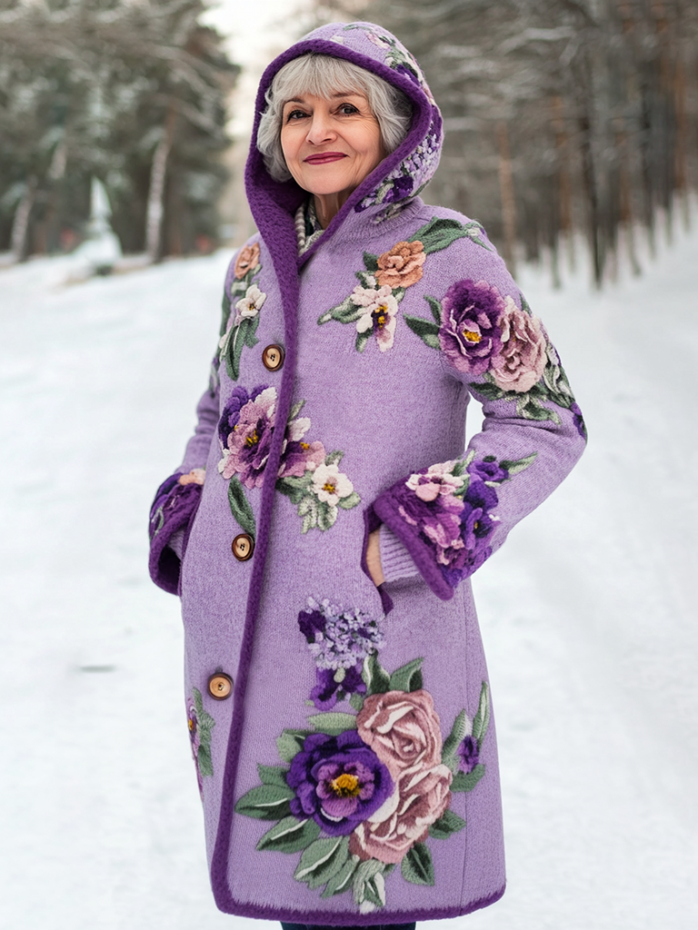 Retro Pansy Floral Embroidery Pattern Cozy Hooded Cardigan