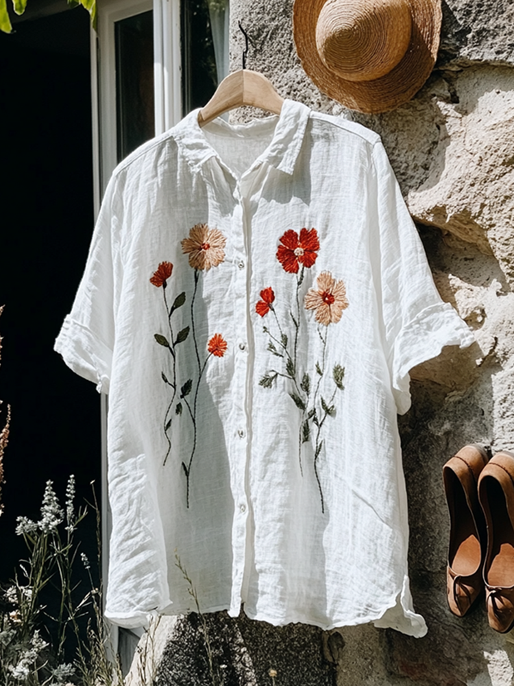 Vintage Floral Embroidery Art Lapel Linen Blend Loose Blouse