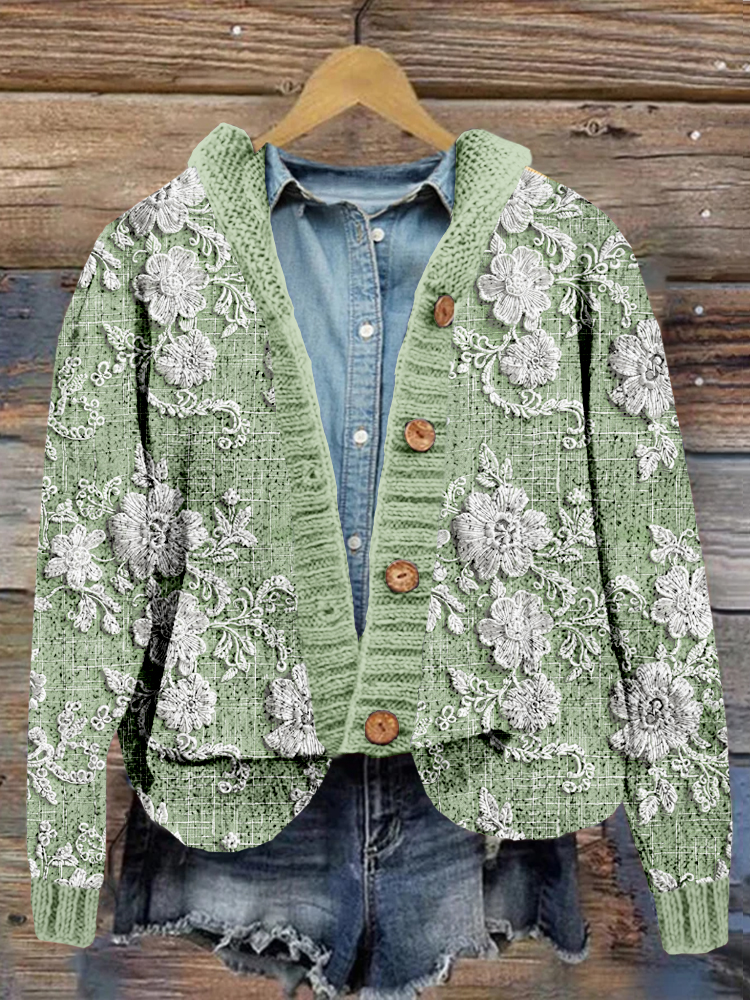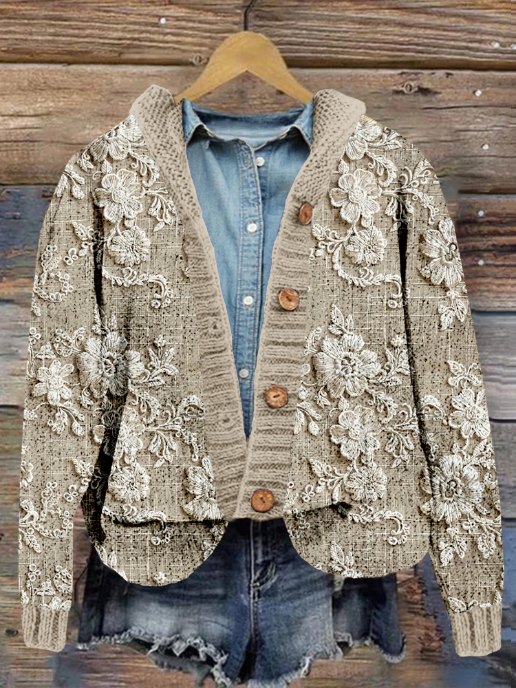 Vintage Floral Lace Embroidered Cozy Knit Sweater