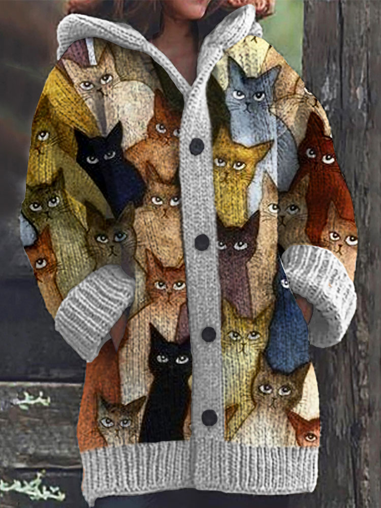 Fuzzy Cats Crochet Art Cozy Knit Hooded Cardigan