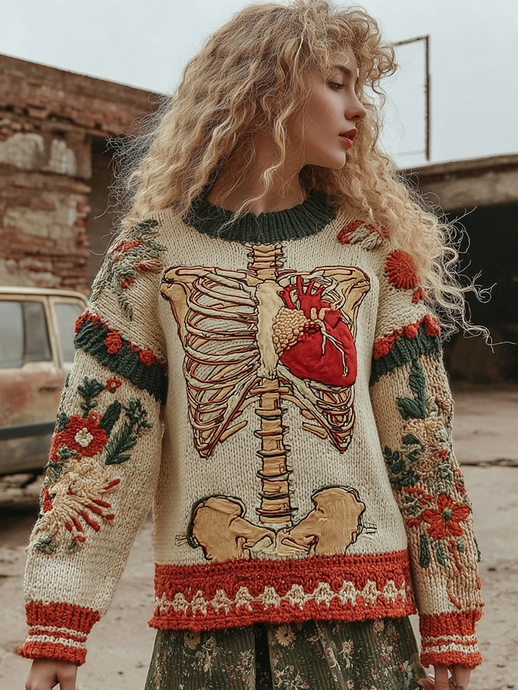 Vintage Anatomy & Floral Embroidery Women's Knit Crew Neck Sweater