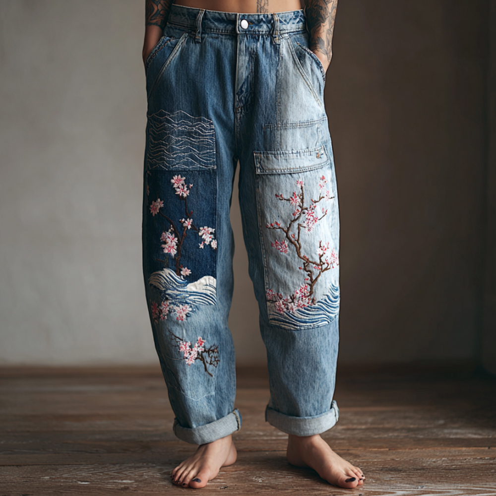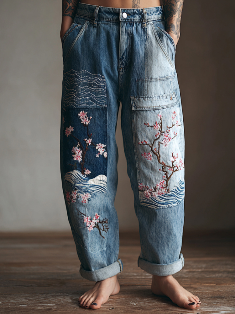 Women's Cherry Blossom And Sea Wave Embroidery Patchwork Art Jeans