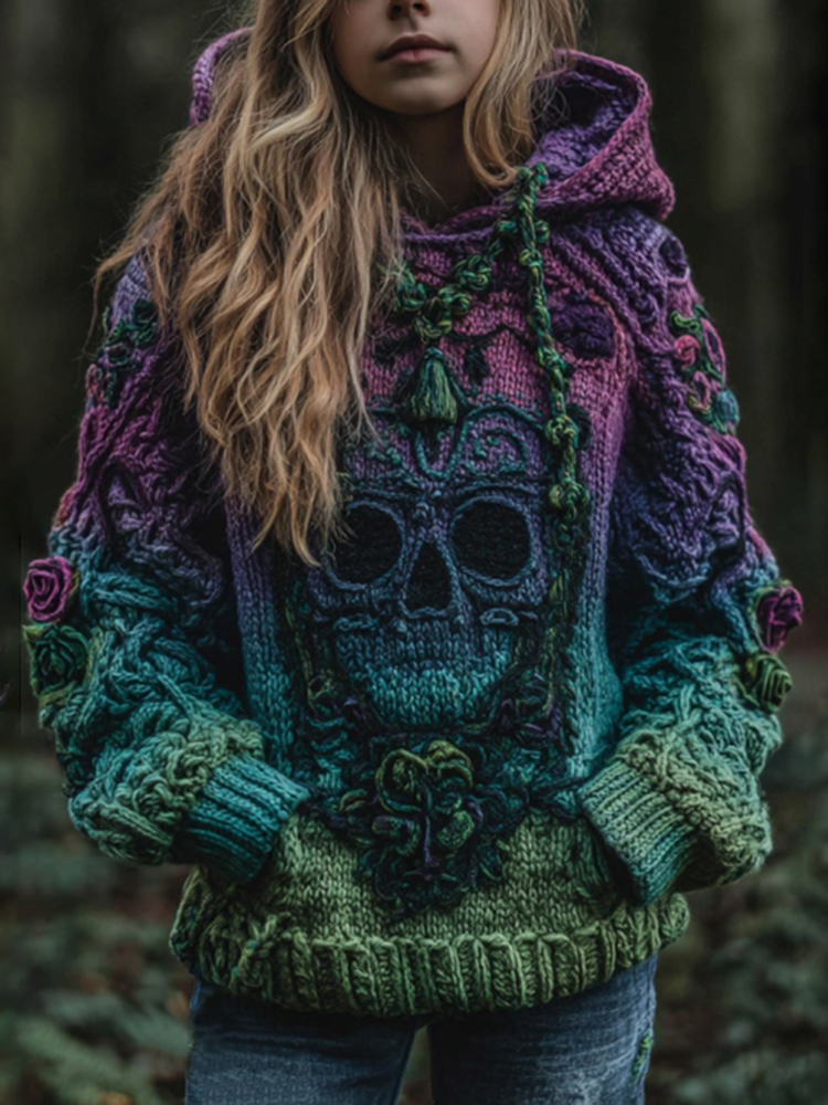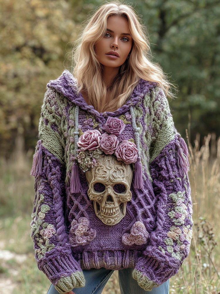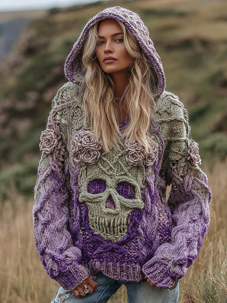 Women's Gradient Rose And Skull Inspired Chunky Knit Hooded Sweater