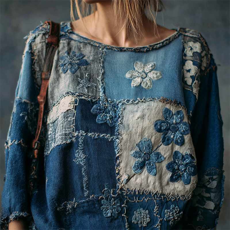 Vintage Floral Japanese Sashiko Embroidered Patchwork Linen Tunic