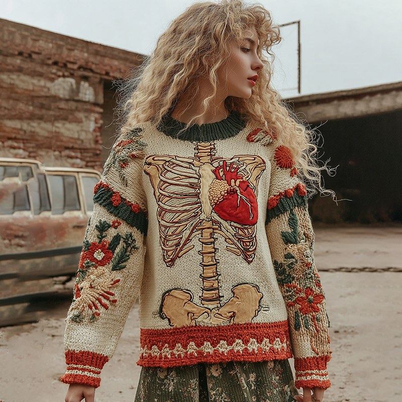 Vintage Halloween Anatomy With Floral Art Chunky Knitted Sweater