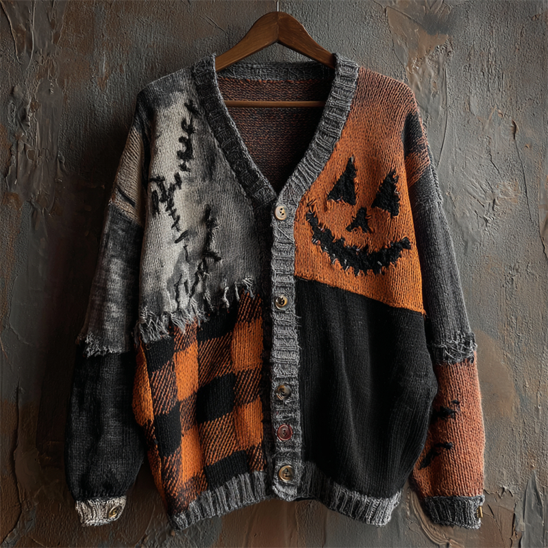 Halloween Pumpkin Face Plaid Patchwork Cozy Knit Cardigan