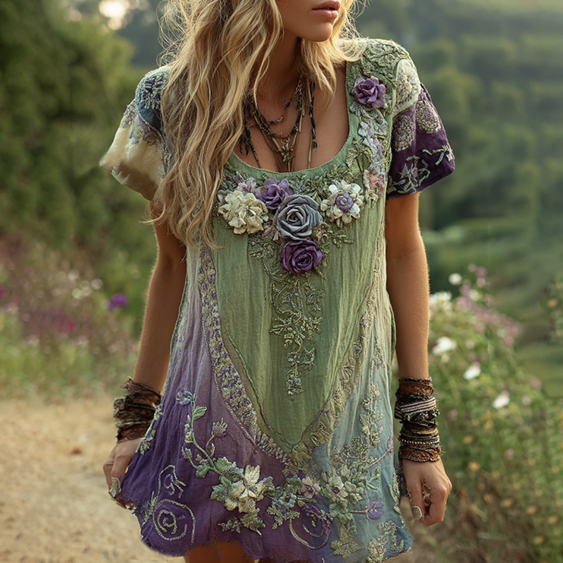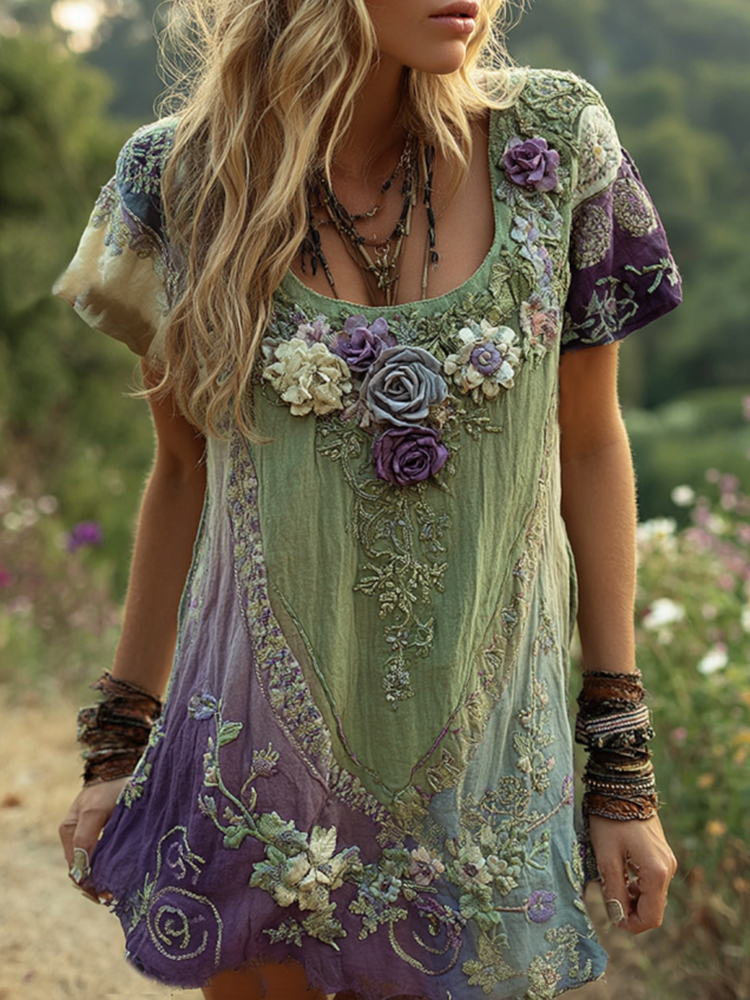 Boho Style Sunset Floral Patchwork Women's Linen Short Sleeve Mini Dress