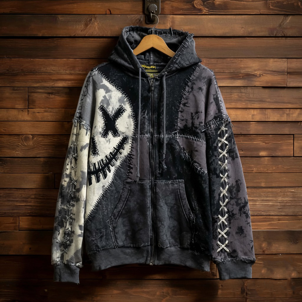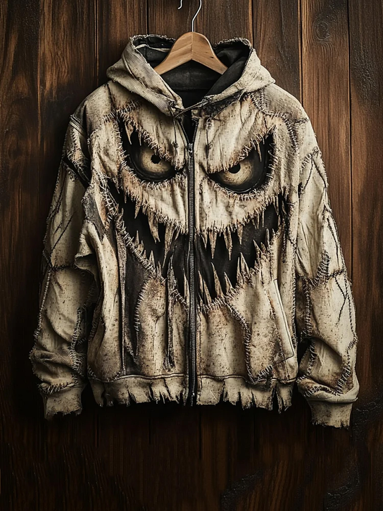 Halloween Horror Scary Face Stitch Patchwork Pattern Washed Men's Zip-up Hoodie