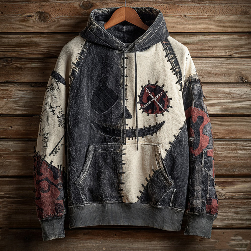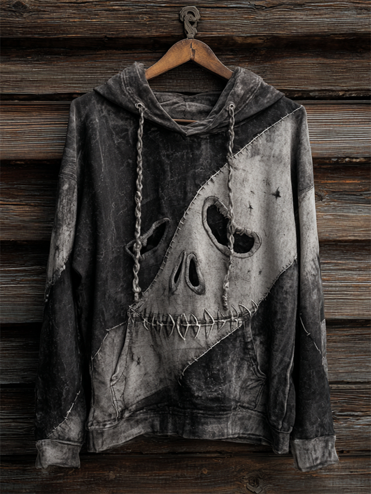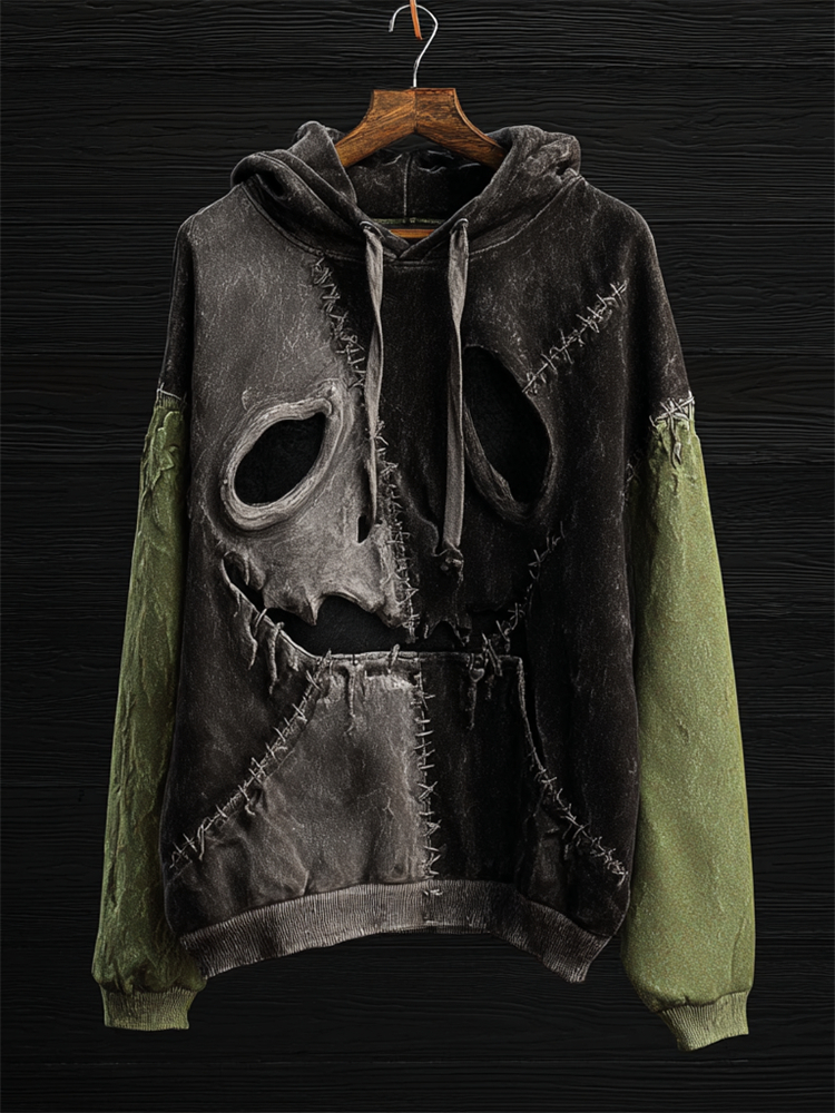 Halloween Skull Face Pattern Stitched Washed Men's Hoodie