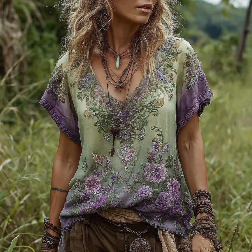 Vintage Flower Embroidery V-neck Short Sleeve Linen T-shirt