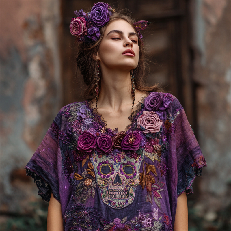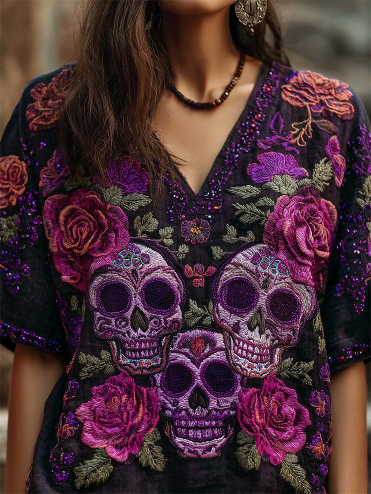 Day Of The Dead Purple Roses Sugar Skull Embroidered Fiber Art Linen Shirt