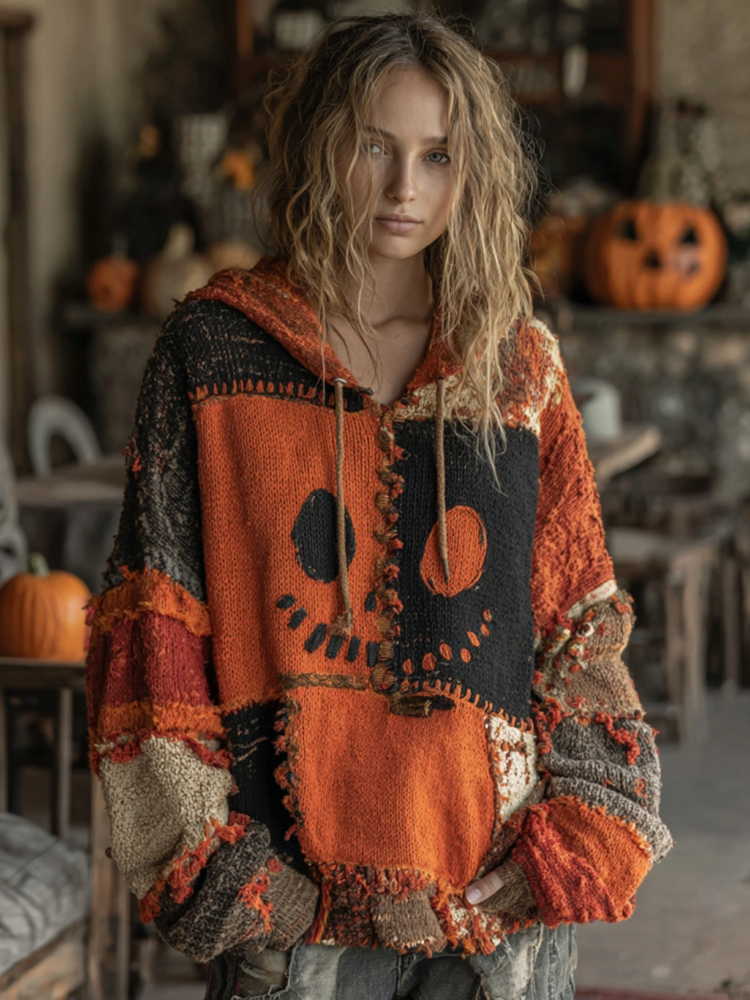 Halloween Spooky Face Patchwork Stitched Cozy Knit Hooded