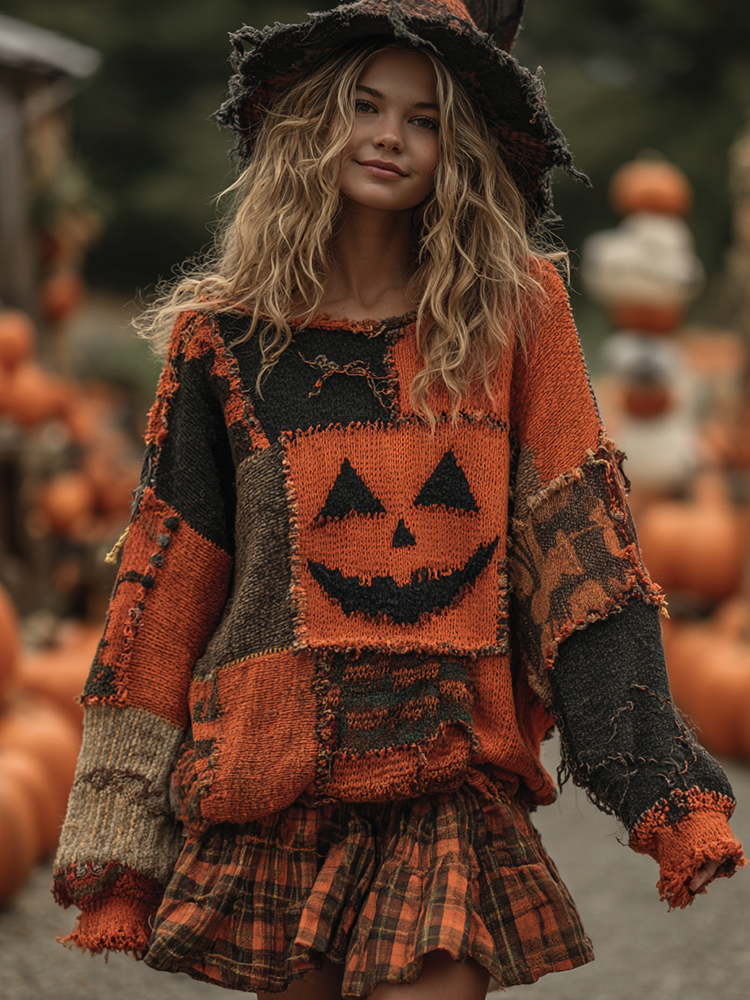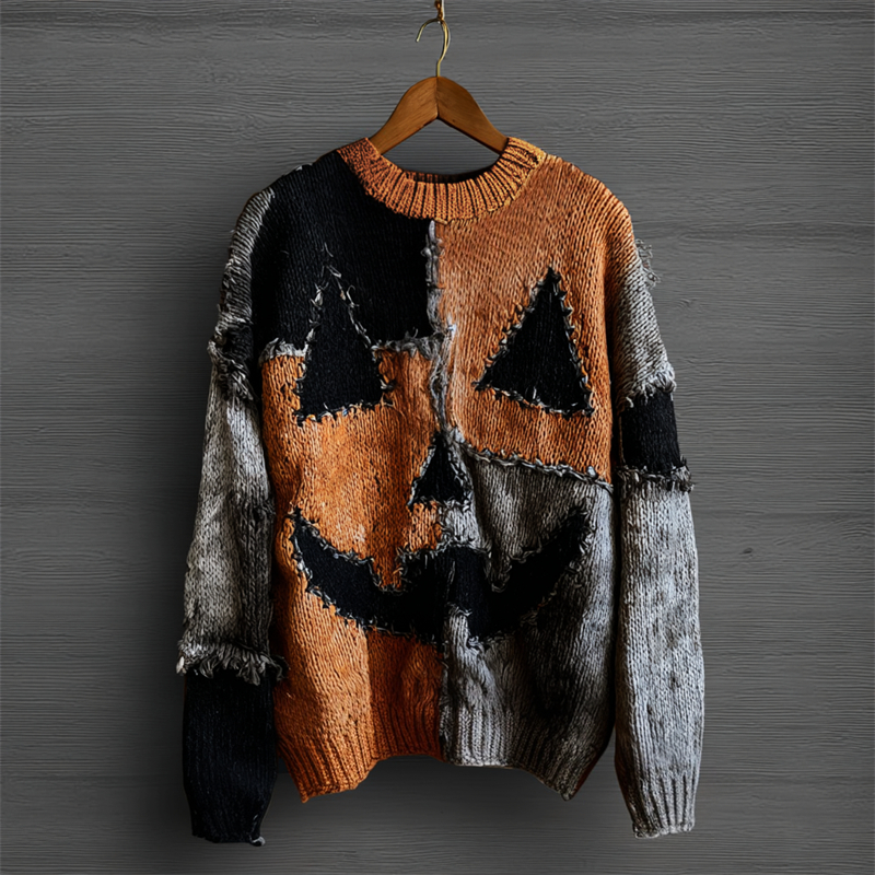 Vintage Patchwork Halloween Pumpkin Face Art Cozy Knit Sweater
