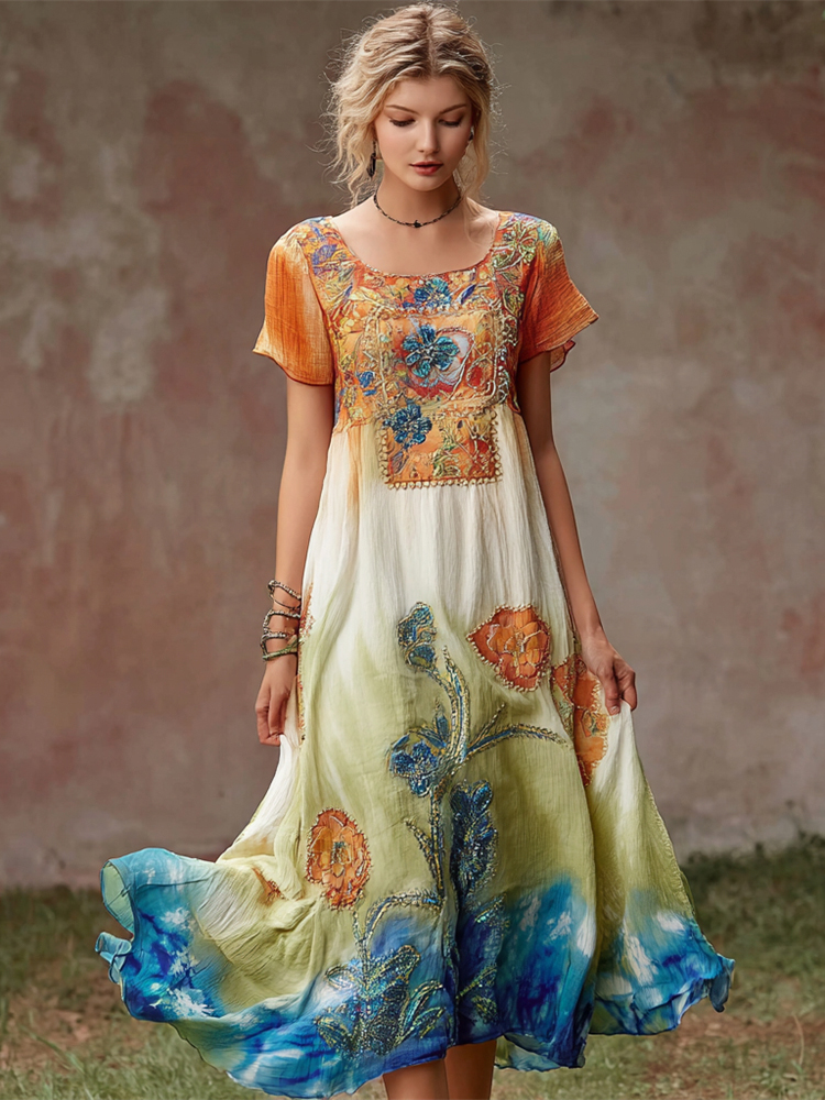 Boho Style Sunset Floral Tie-dye Women's Linen Short Sleeve Maxi Dress