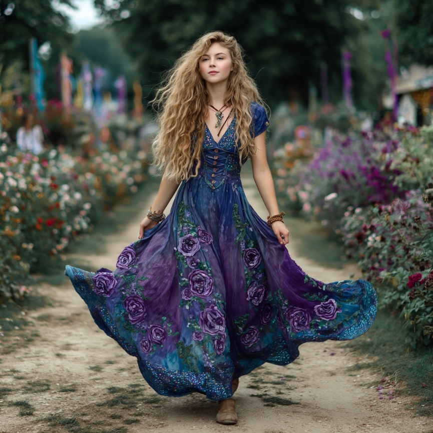 Women's Vintage Embroidered Pansy Floral Belt Vest Maxi Dress