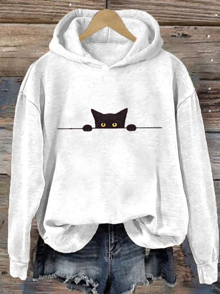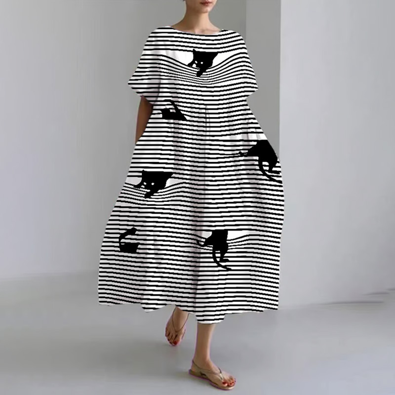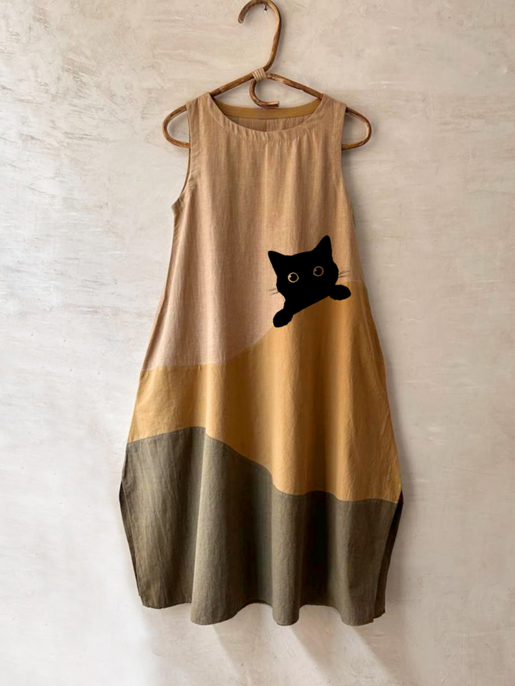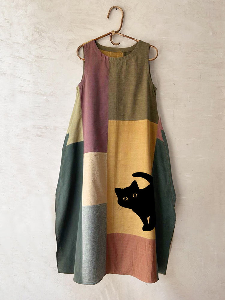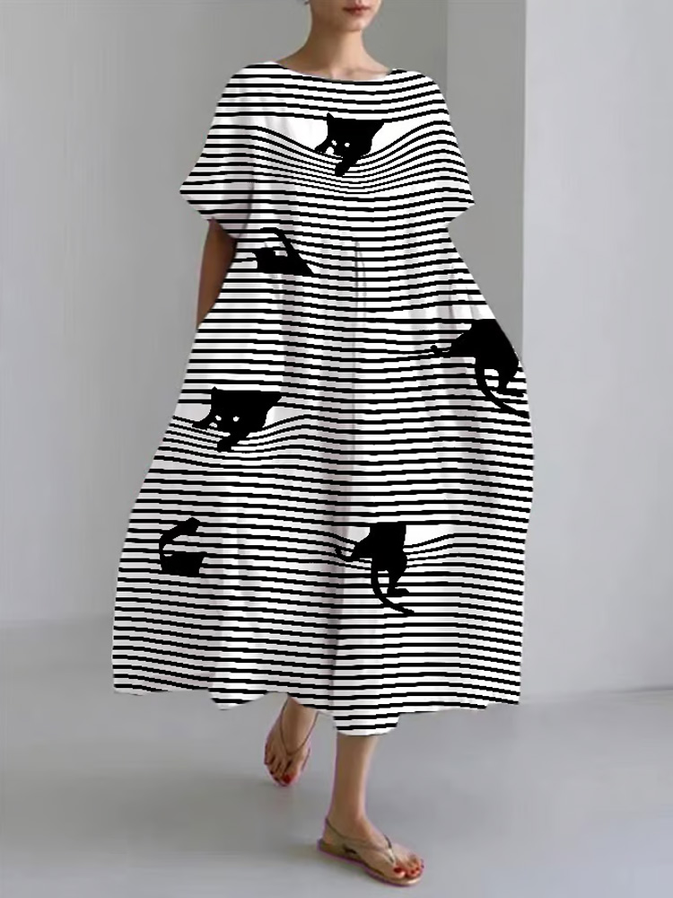 Women's Cute Black Cat Contrast Color Design Midi Dress