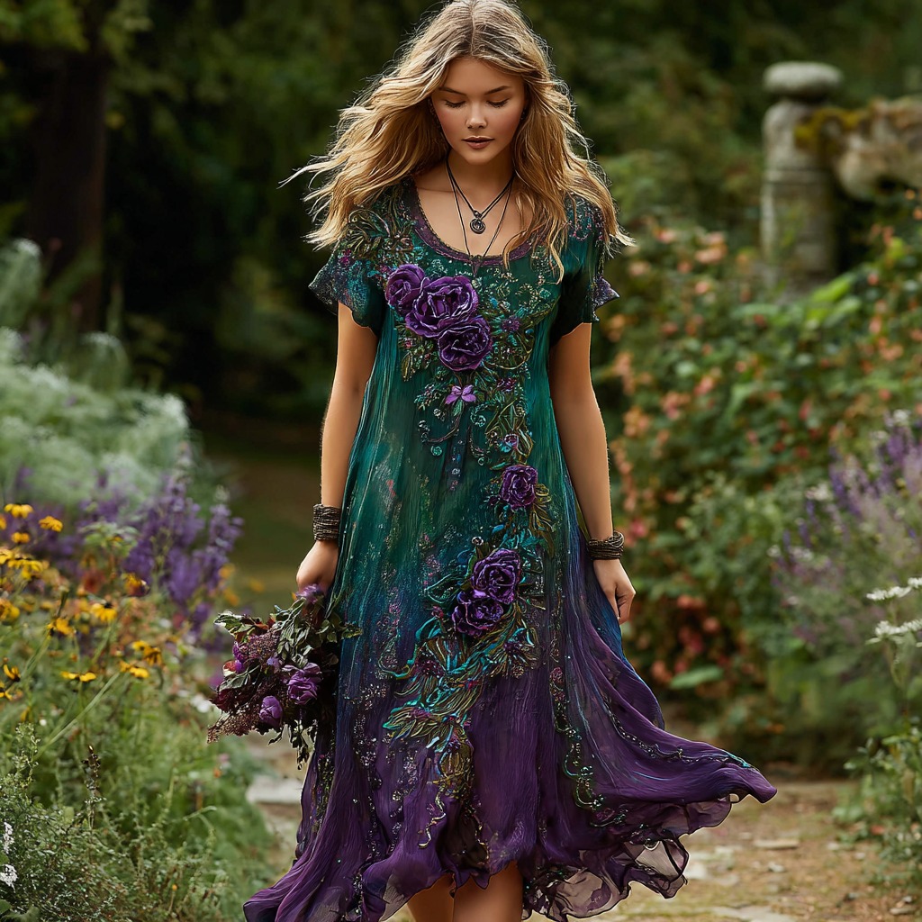 Women's Vintage Floral Embroidery Gradient Pattern Round Neck Dress