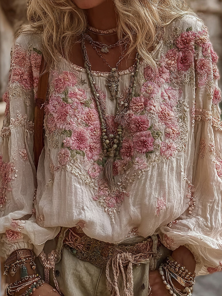 Women's Vintage Floral Embroidery Casual Crew Neck Shirt