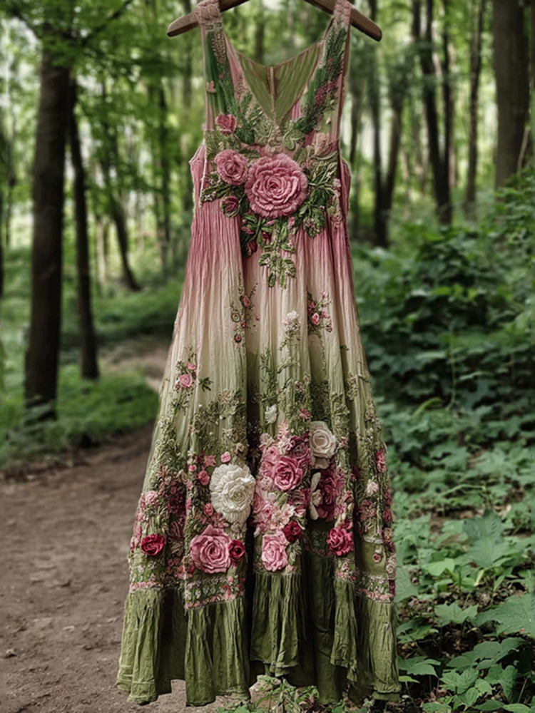 Vintage Classy Boho Gradient Pink Roses Embroidered Linen Maxi Dress