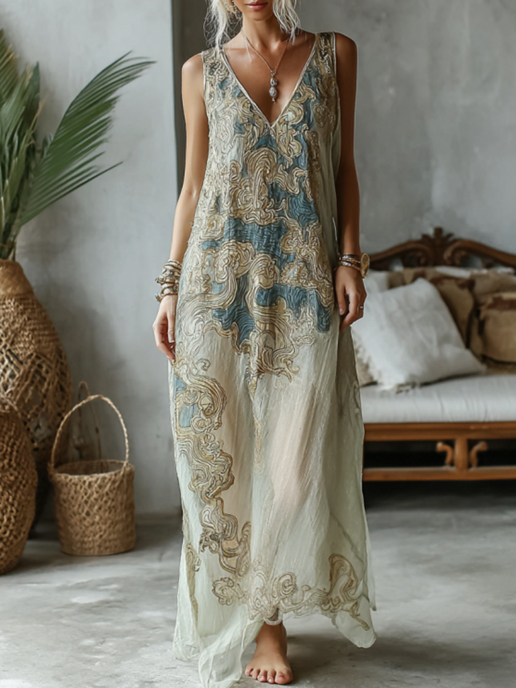 Vintage Marble Texture Collection Retro Bohemia Gradient Gilded Pattern Linen Maxi Dress