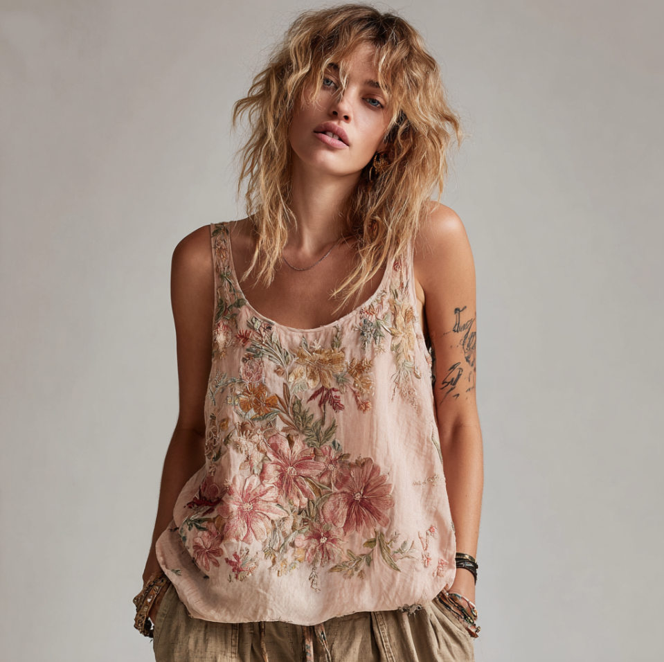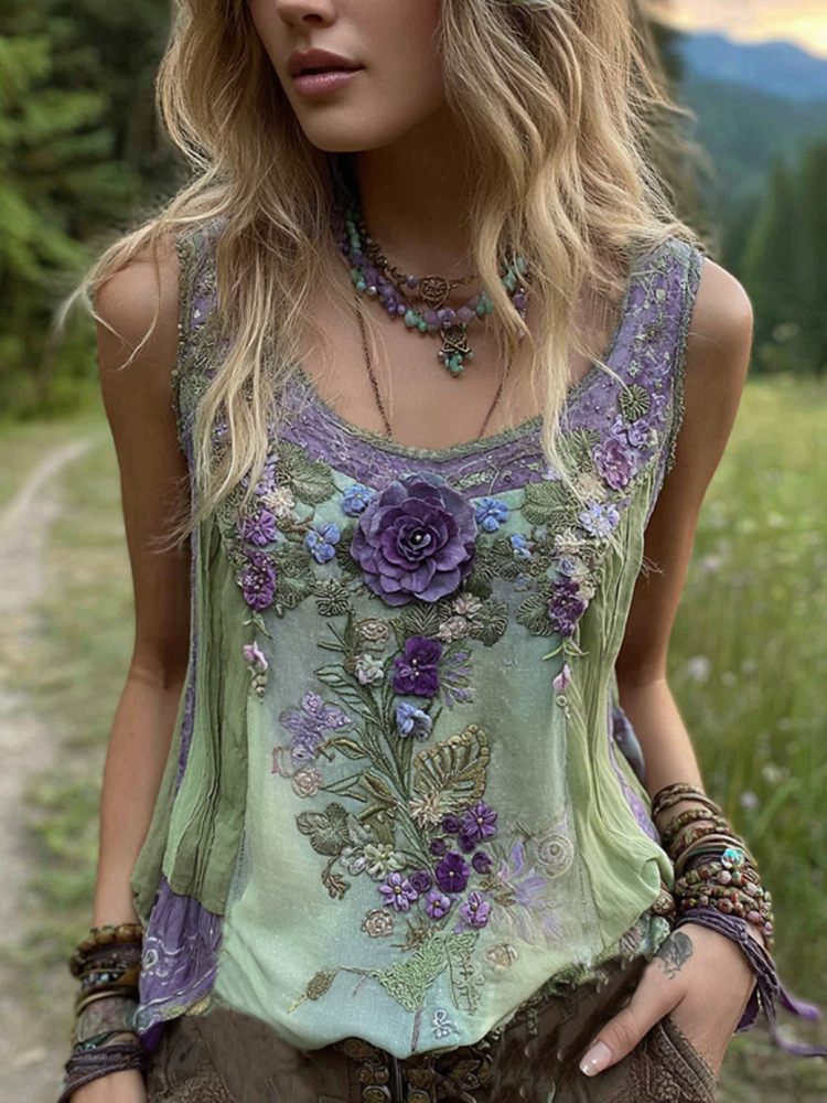 Vintage Classy Gradient Purple Lavender And Floral Embroidered Pattern Linen Tank Top