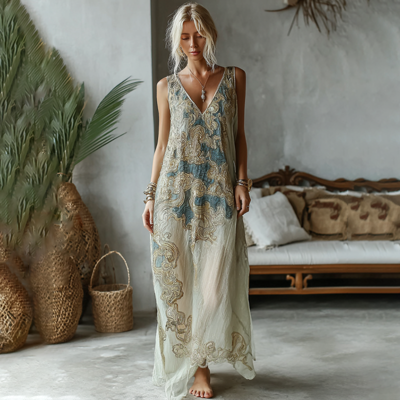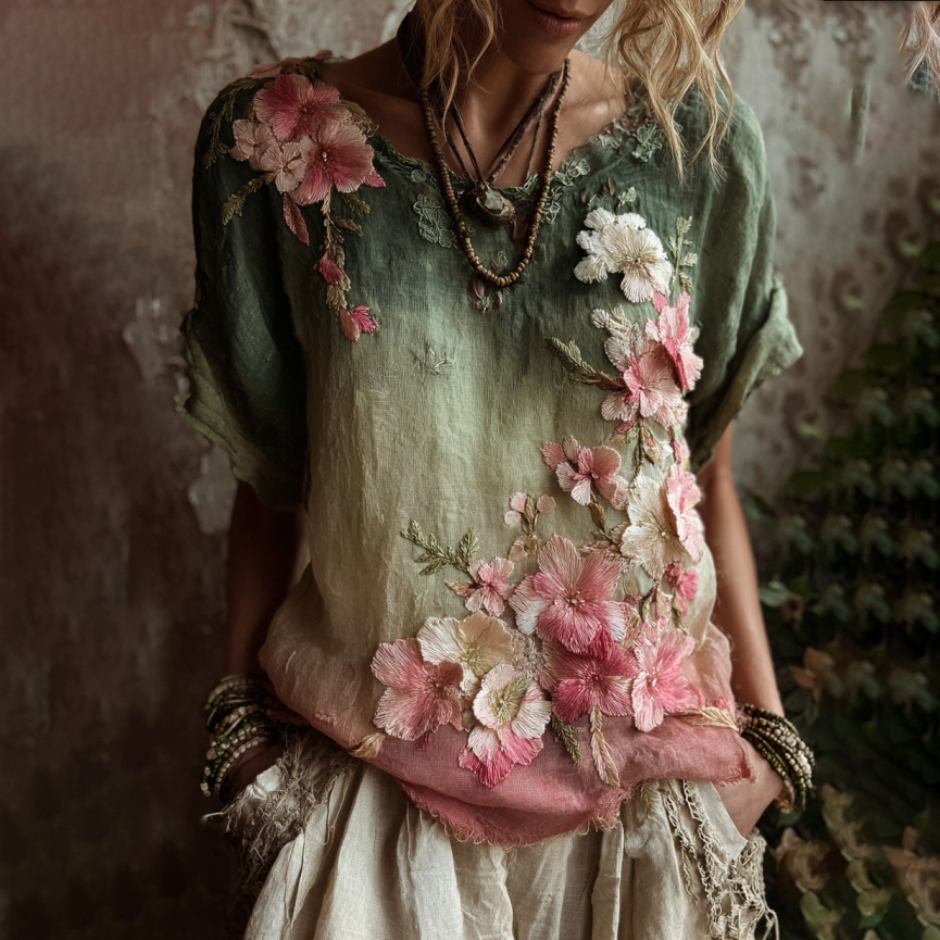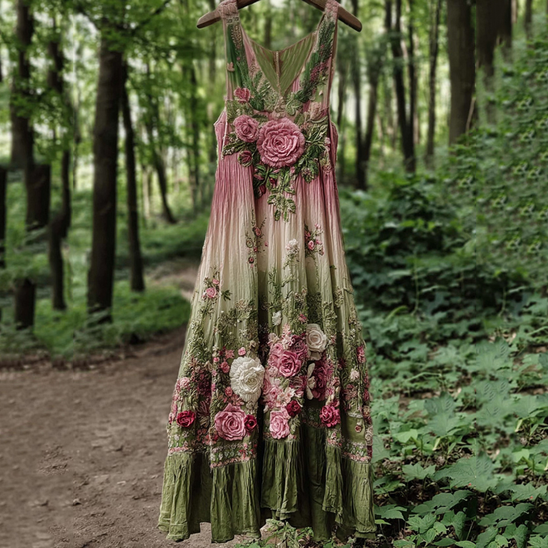 Vintage Floral Embroidered Gradient Linen Maxi Dress