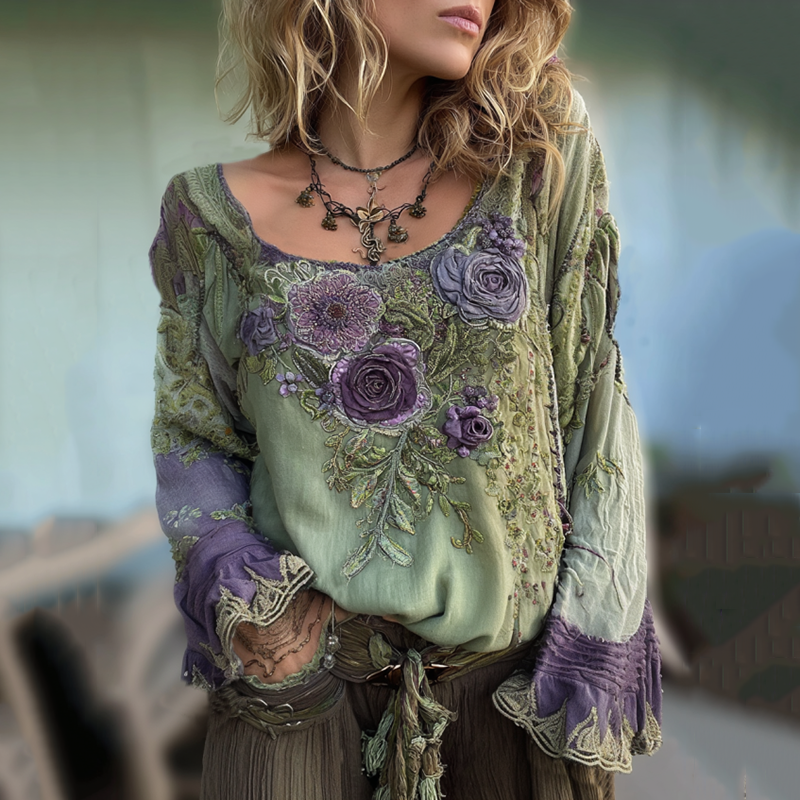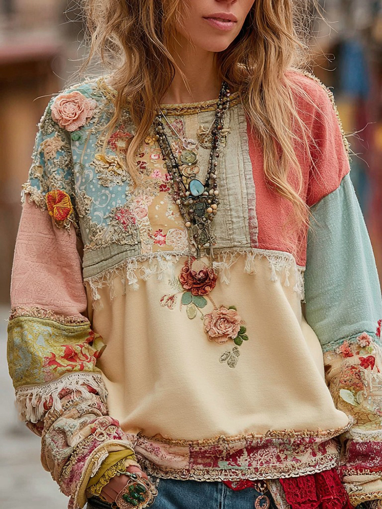 Women's Retro Bohemian Rose Floral Stitching Comfortable Crew Neck Sweatshirt
