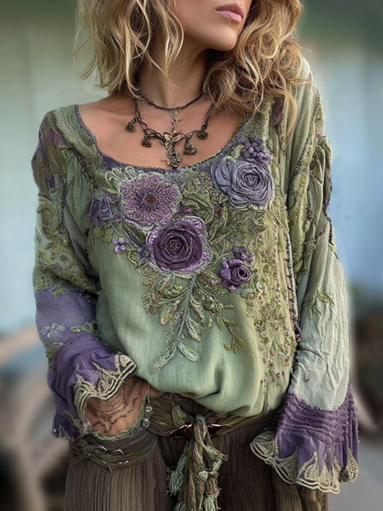Vintage Purple Lavender And Floral Embroidered Linen Long Sleeve Shirt