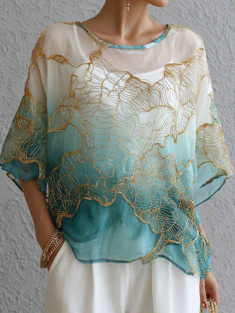 Vintage Marble Texture Collection Retro Bohemia Women Style Gradient Gilded Pattern Linen Round Neck T-shirt