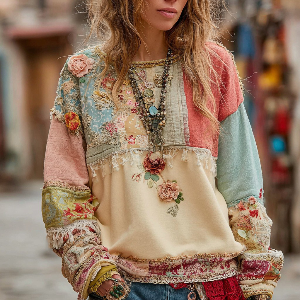 Women's Vintage Floral Patchwork Art Cozy Warm Sweatshirt