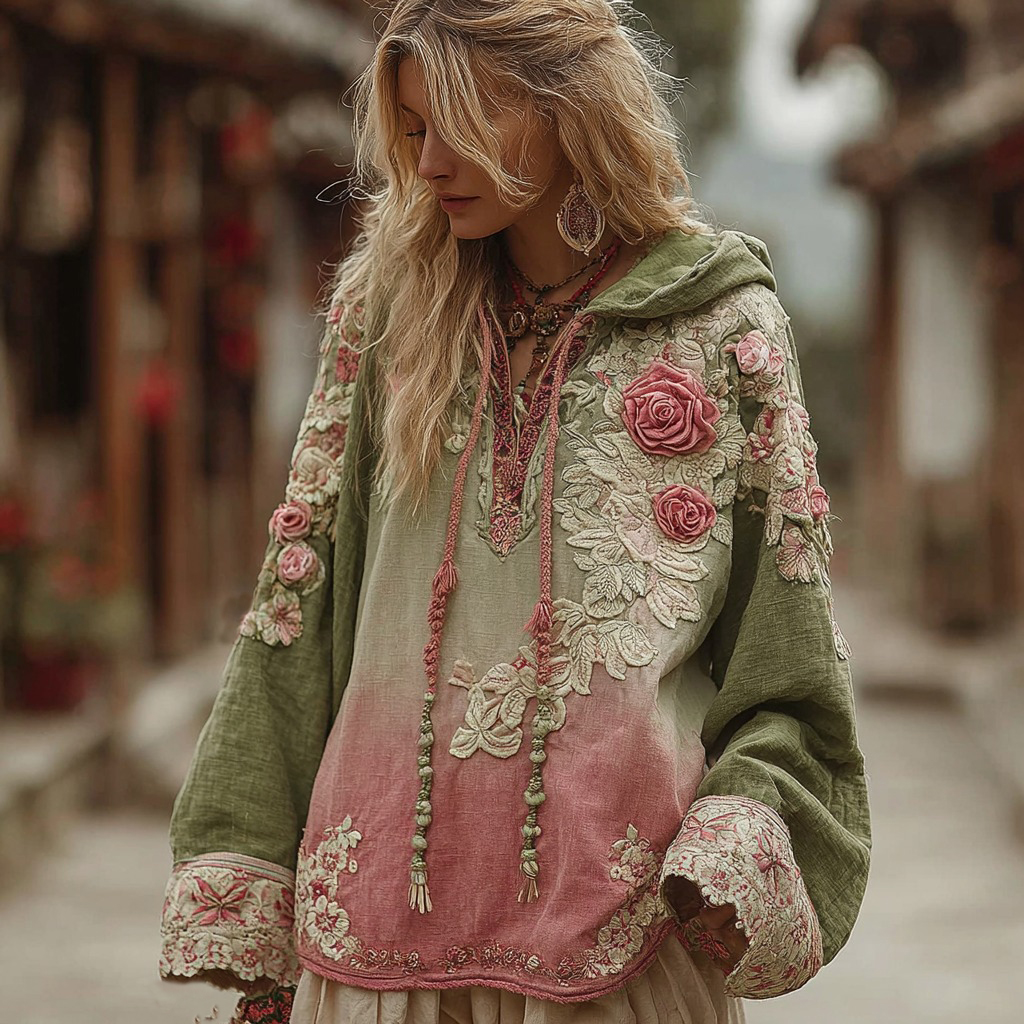 Love & Health Collection Classic Floral Embroidery Gradient Art Linen Long Sleeve Hoodie
