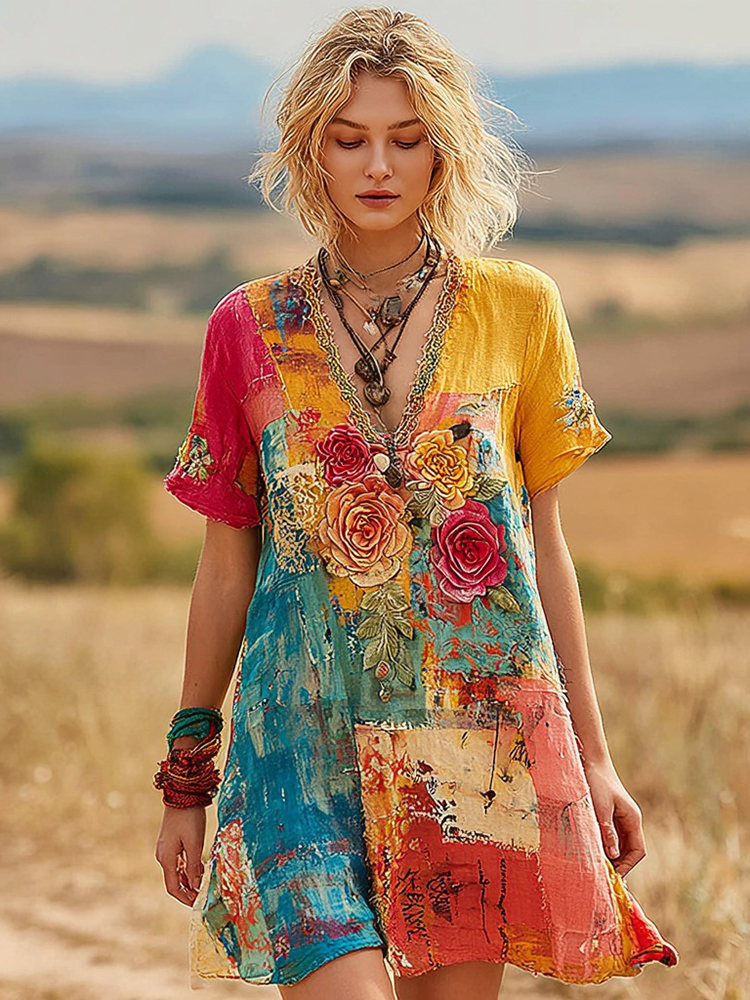 Women's Vintage Oil Painting Floral Art Color Block Linen V-neck Dress