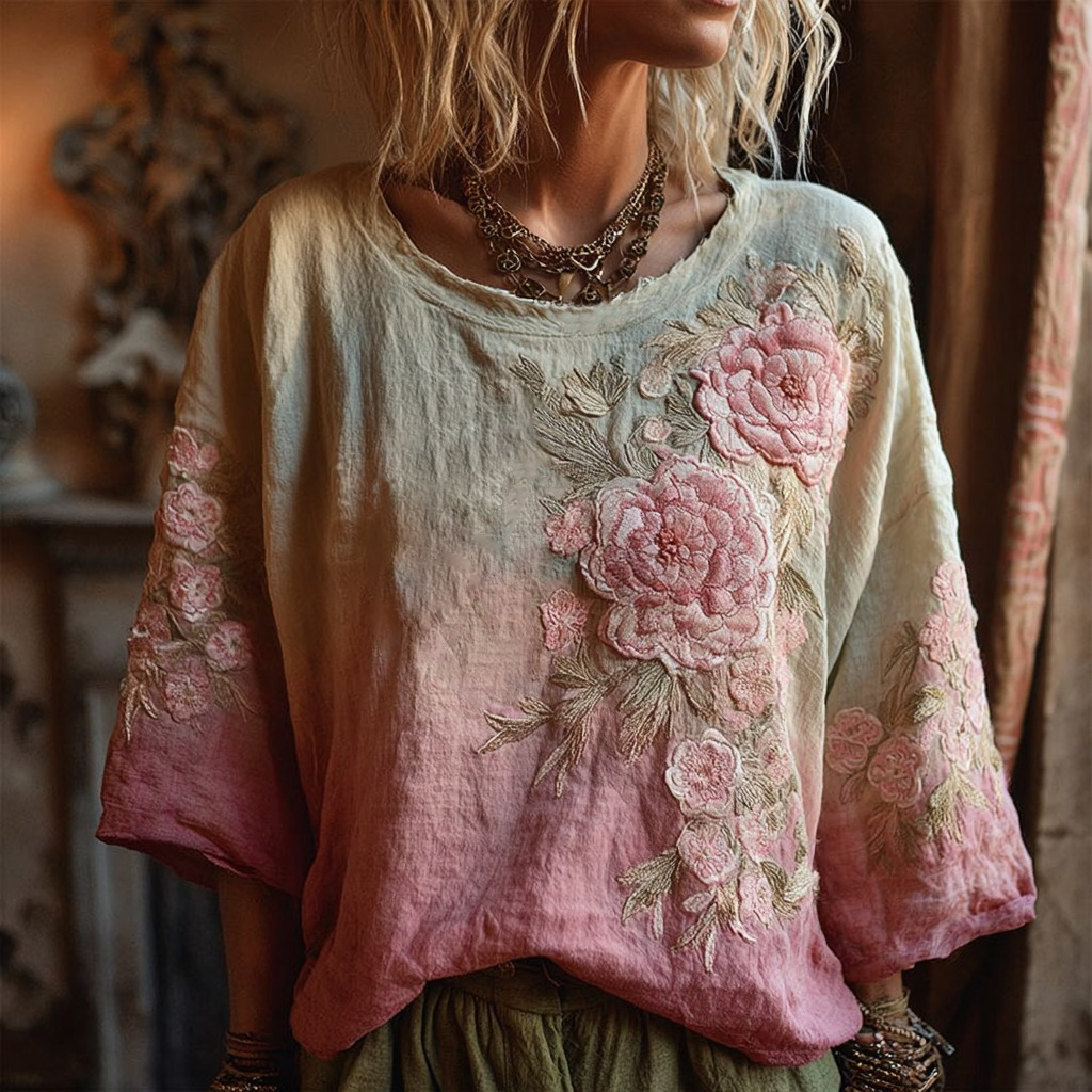 Vintage Rose Gradient Art Linen Three-quarter Sleeves Shirts