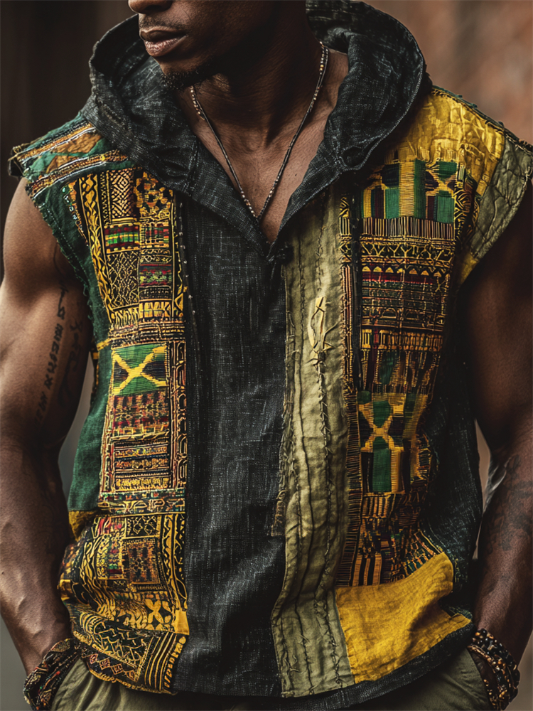Men's Reggae Lover Jamaica Flag Kente Patchwork Hooded Linen Tank